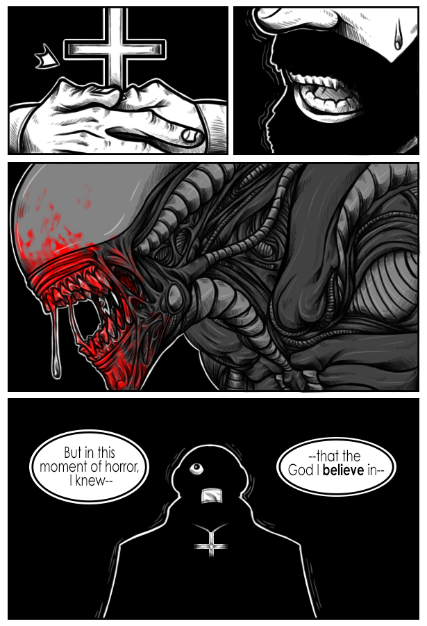 Aliens Zealot is a short narrative, a fan comic based off of the Alien franchise. Father Noah, a priest who travels from world to world spreading the word of God, a lie he says. But when he and his crew come to a new planet, he realizes the God that he believes in, truly is real.