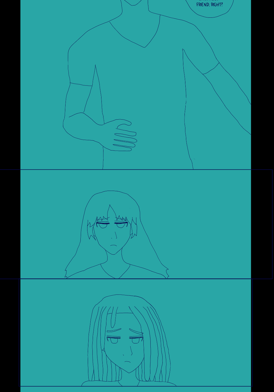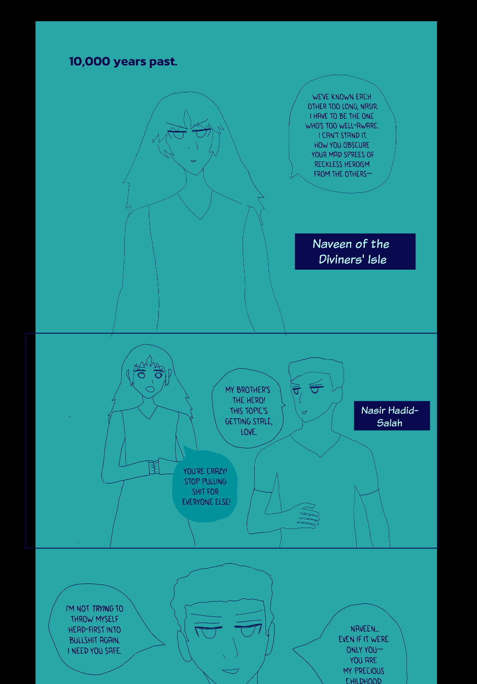 The aquamarine panels are full (sketch only) preview of early Blue Horizon: Bright Days, Sad Days "comic 5" panels.