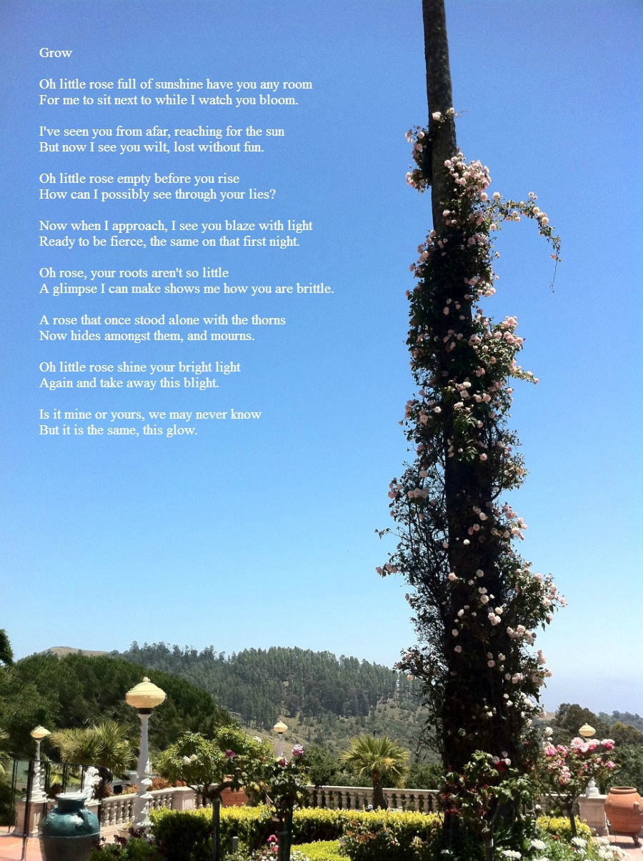 Sometimes, things grow where you least expect them. Oh little rose full of sunshine have you any room For me to sit next to while I watch you bloom. I've seen you from afar, reaching for the sun But now I see you wilt, lost without fun. Oh little rose empty before you rise How can I possibly see through your lies? Now when I approach, I see you blaze with light Ready to be fierce, the same on that first night. Oh rose, your roots aren't so little A glimpse I can make shows me how you are brittle. A rose that once stood alone with the thorns Now hides amongst them, and mourns. Oh little rose shine your bright light Again and take away this blight. Is it mine or yours, we may never know But it is the same, this glow.