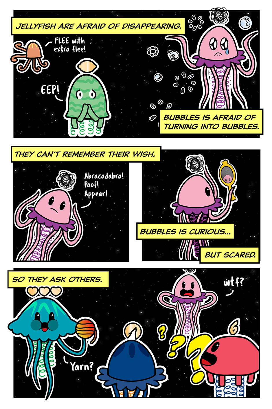 Every wish turns into a jellyfish with something special symbolizing their wish floating above their head. Jellyfish travel the galaxy until they're ready to come true.