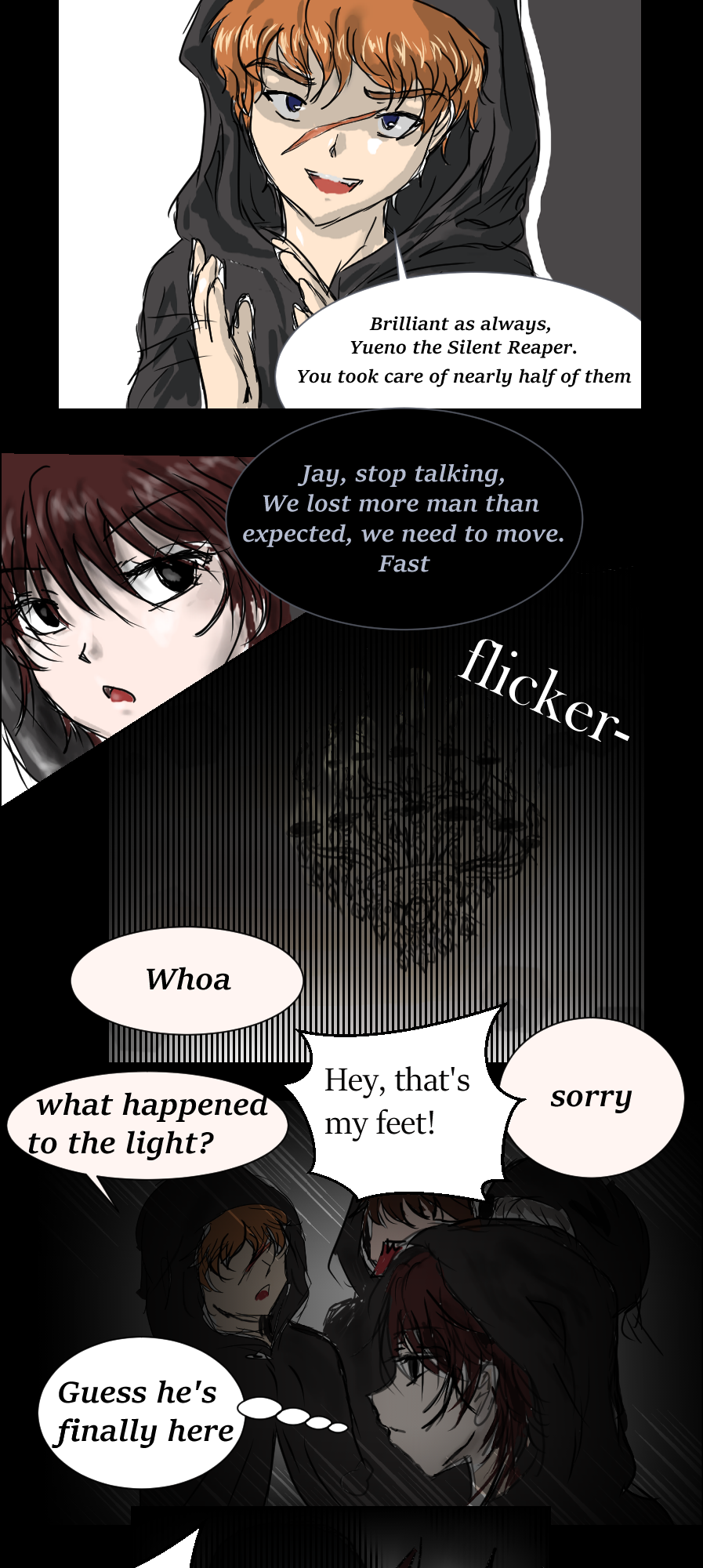 In the aftermath, two ominous figures emerge: Yueno, a cold and efficient assassin known as the Silent Reaper, and Jay, her reckless, talkative partner. But their dynamic is upended when the lights vanish into utter darkness, announcing the arrival of someone far more terrifying—a being not merely cloaked in shadow but made of it.