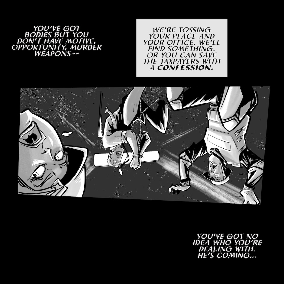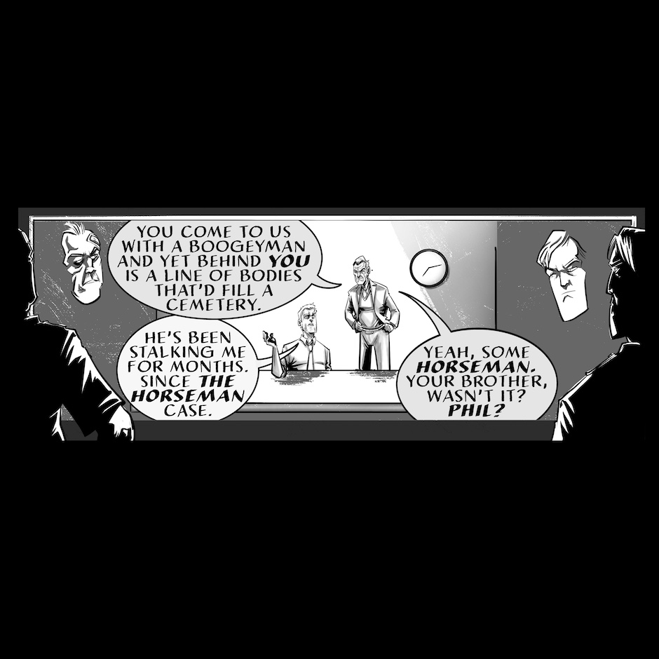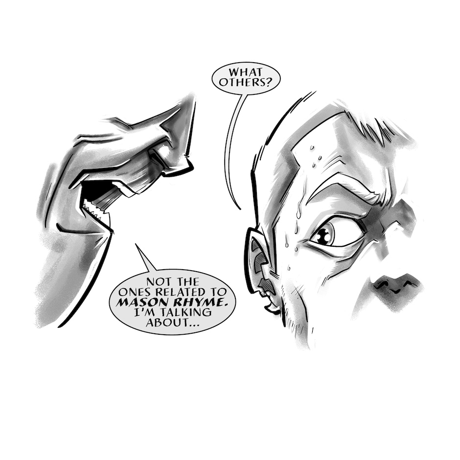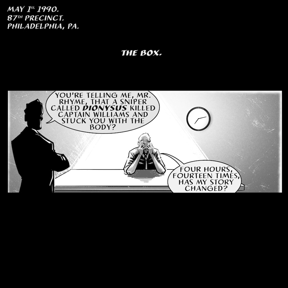 Mason Rhyme's surrendered to the cops. He's been grilled for fourteen hours. His mind's fried. There's no sizzle left to his story. All he can do is wait for who's coming. Will the Force figure out Mason's telling the truth about a boogeyman that's frame him? Or will more blue uniforms be blood red before the day's out? Find out how deep into Mason's past Dionysus has gone...