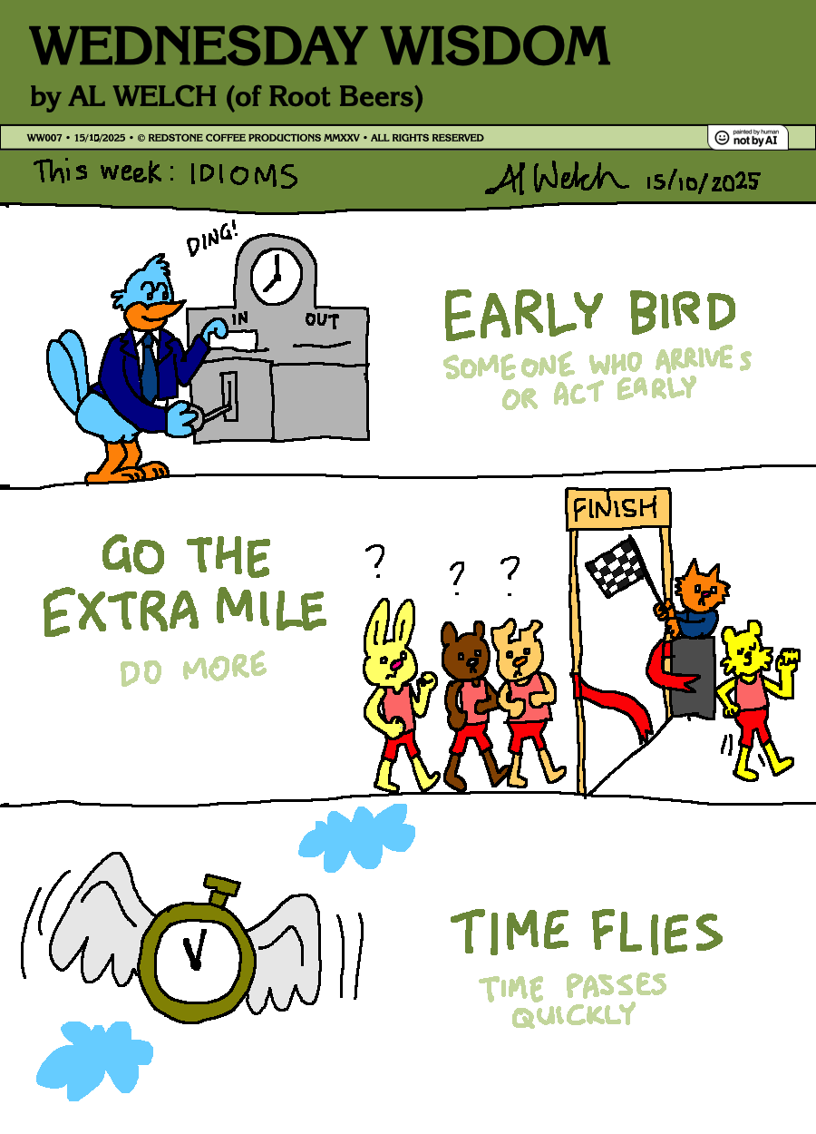 Greetings, Professor Owl Welch's here again, with another set of idioms. This time, we see a bunch of runners, plus a flying clock.