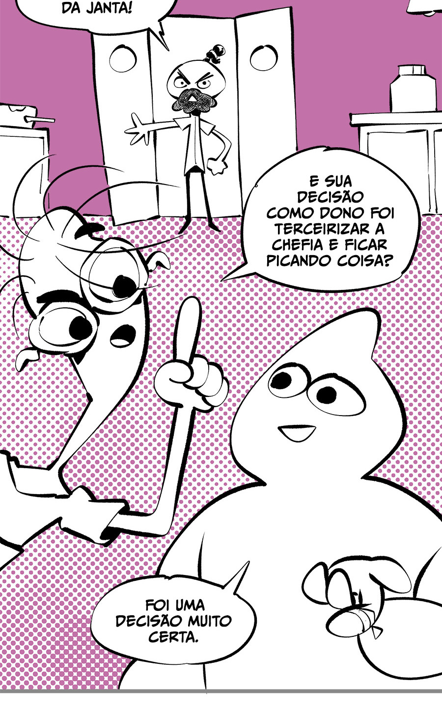 Essa é a história de um verme alienado chamado Télvis, se fudendo muito ao ser retirado de sua bolha, encarando a realidade dos corredores do enorme edifício intestinal Le Tripat. Com bondosas senhoras militantes da pena de morte, patrões hipsters assediadores, cabelereiros homofóbicos e punks de Jesus, o prédio é um lugar cheio de contradições que vive a “mamadeiradepiroquização” da sociedade, um verdadeiro intestino ultra conservador.