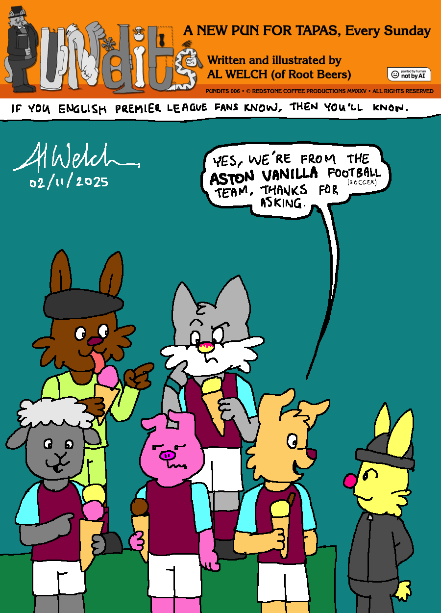 Ever seen an English football (soccer) team enjoy their ice cream? Well, this week's punny comic may reveal why. (For those who don't get it, Aston Vanilla is a spoof name for Aston Villa Football Club, an English Premier League team in Birmingham, England.)