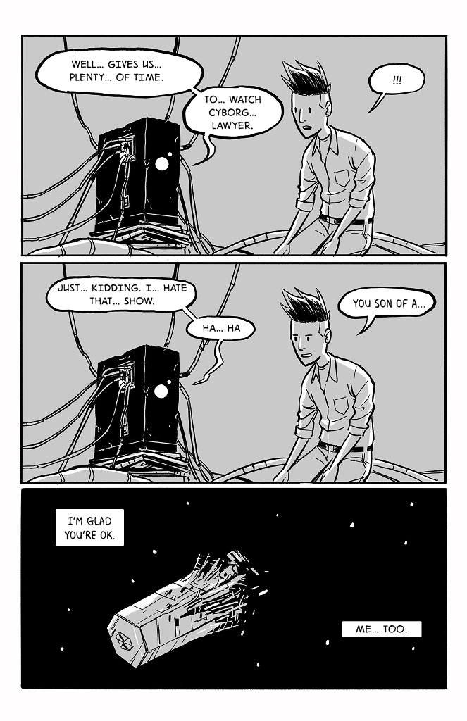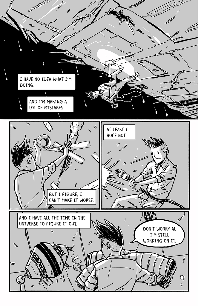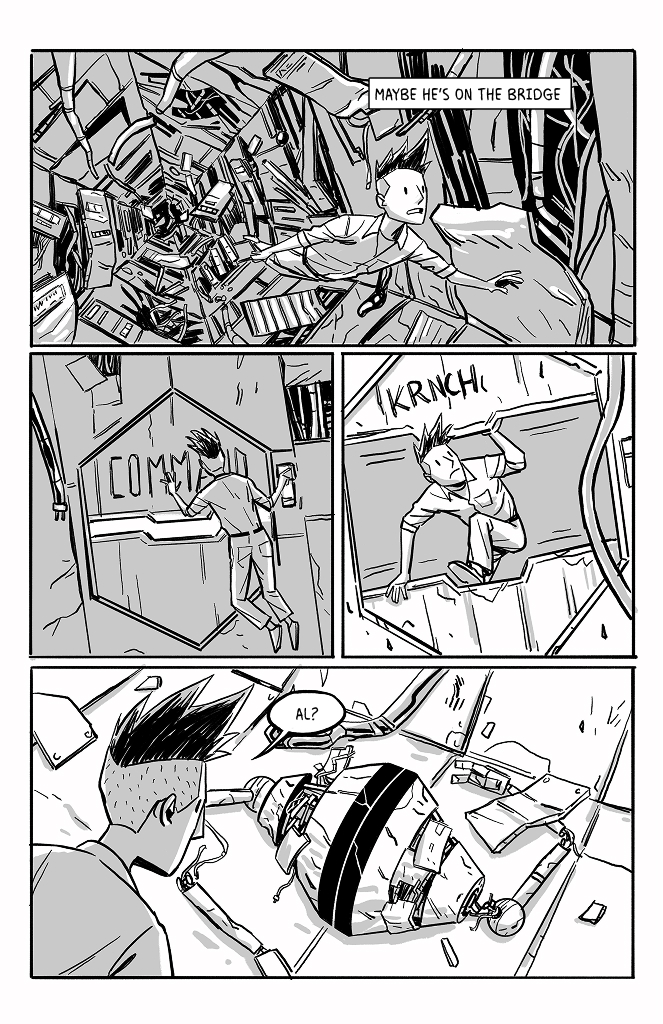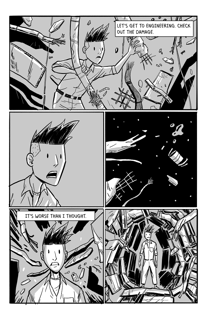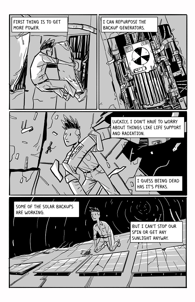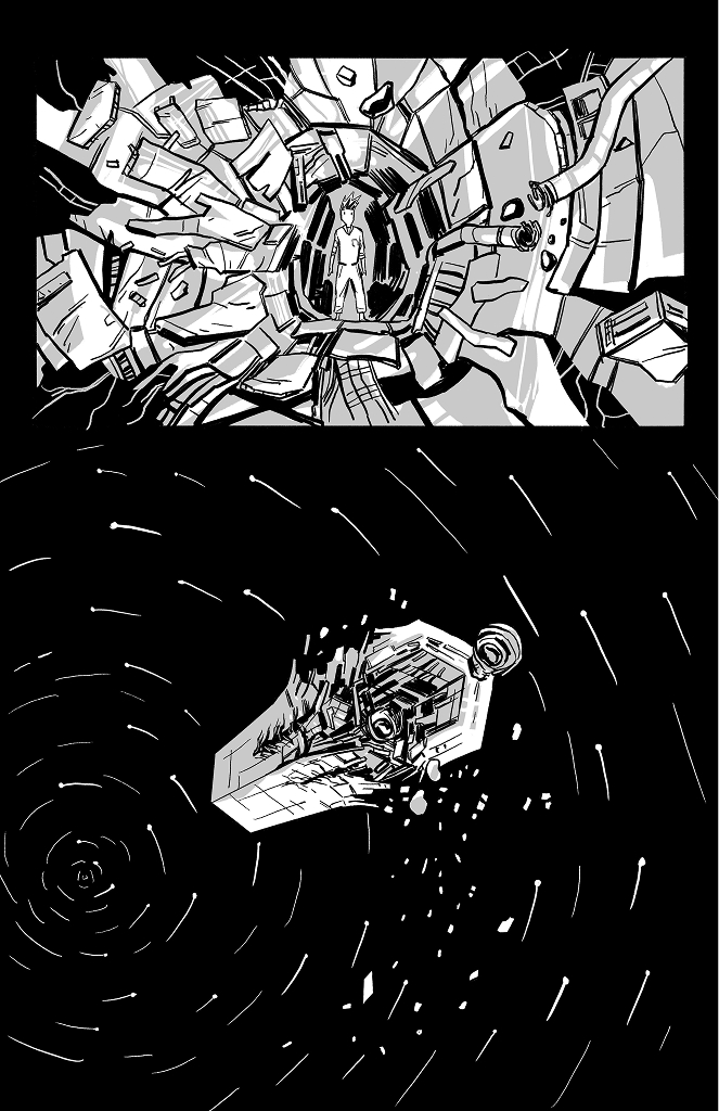 I like that you included the star spin in the backgrounds. As a ghost that can interfere with physical objects, couldn't he potentially exert enough rotational counterforce over time to stabilize the wreckage?