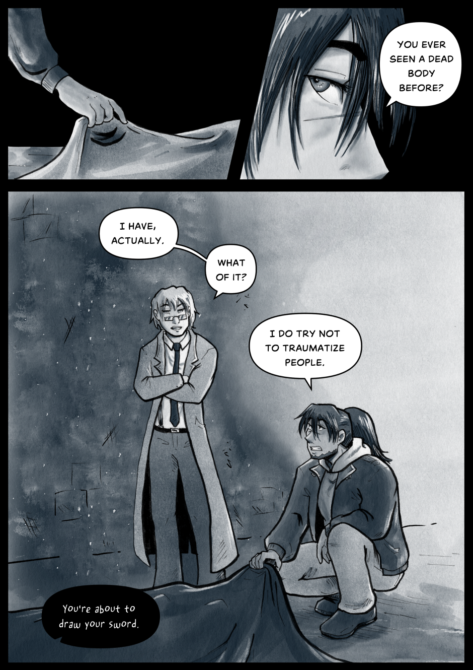 CW: Mature audiences only, please. Contains occasional death, blood, strong language, partial nudity, violence, alcohol use, smoking, and references to abuse.