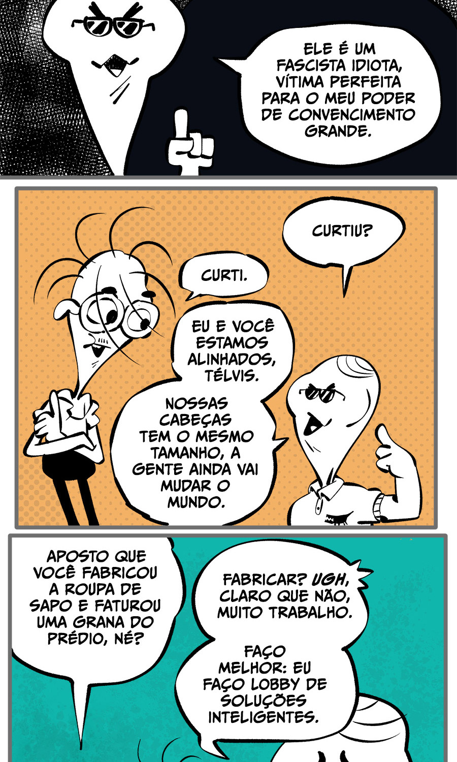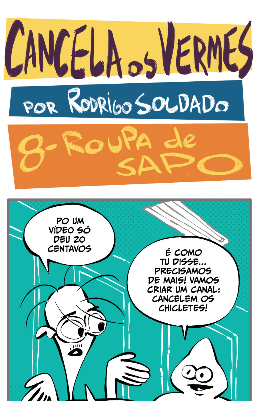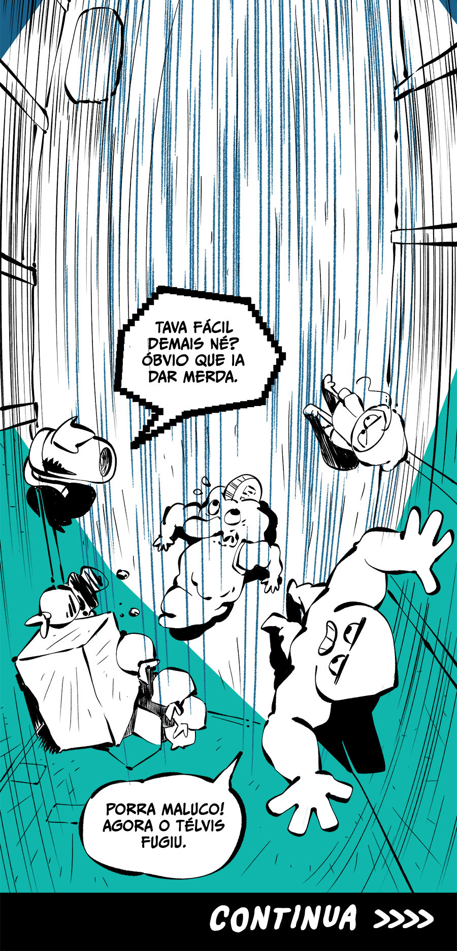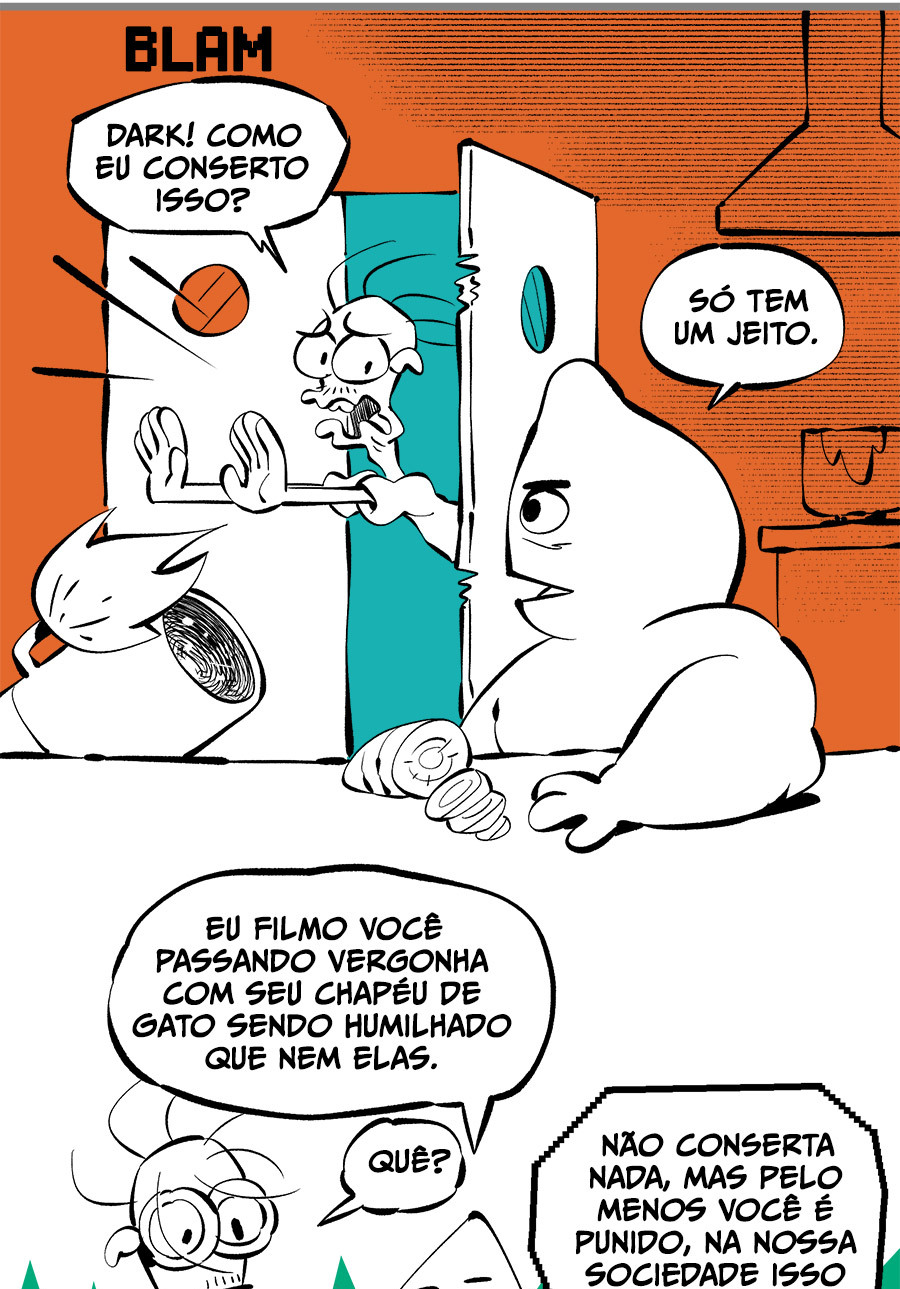 Entre empregos humilhantes, diarreias evangélicas, spoilers violentos, coaches do tempo e síndicos fascistas, Télvis contará com seu amigo Dark e com a misteriosa Câmera para fazer desse mundo intestinal um lugar menos nojento. Não no sentido higiênico, claro.