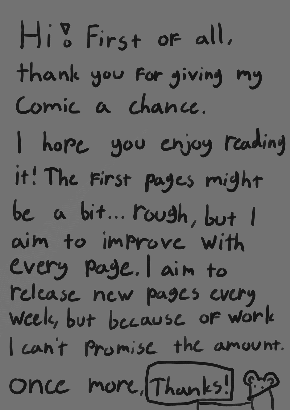 Hi! RatAtWork here! This will be the first comic that I have published, so the first pages might be a bit rough. My goal is to improve as an artist and a story teller while providing the world with one of my works. In a way, this is also a journey of growth for me just as it is for Lempi. I hope you enjoy reading it.