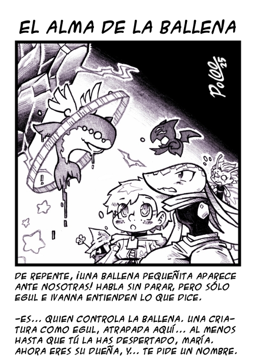Act 2: ¡Parece que María ha despertado al espíritu que habita la ballena! Una criaturita no muy distinta a Egul que los keljar atraparon en su corazón para servir de "interfaz" de la nave. Pero a María no creo que le parezca bien tener a otra persona en "propiedad"...