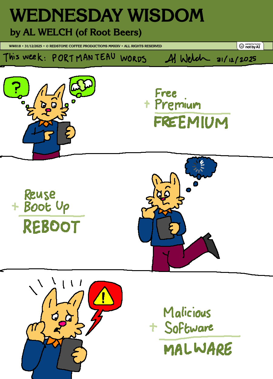 Greetings! Professor Owl Welch's here again, with another set of portmanteau words, in which two small words would make one big word. This week, we have one cat who had trouble with his new mobile phone, which was a bit of a shame as this is his Christmas present.