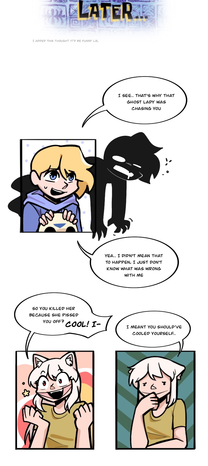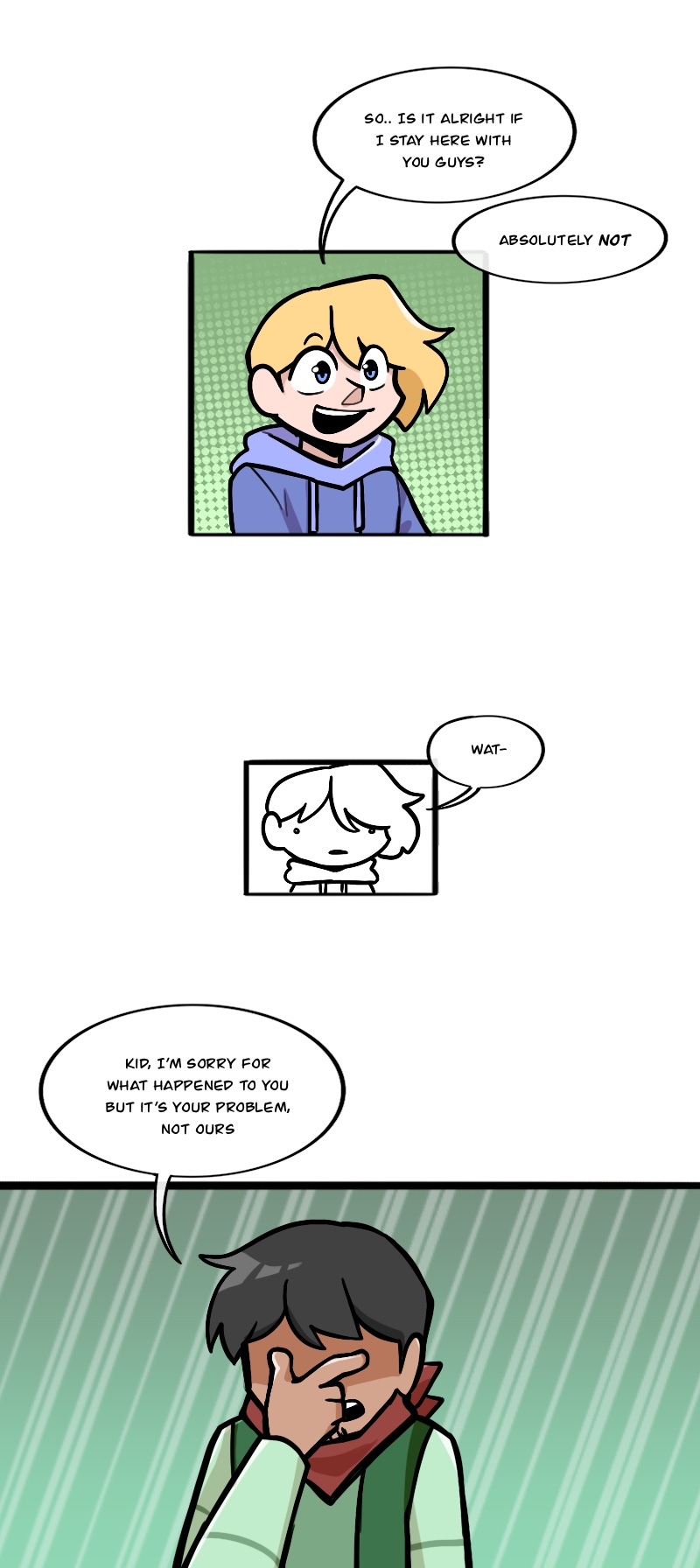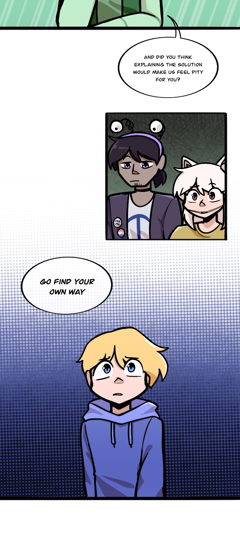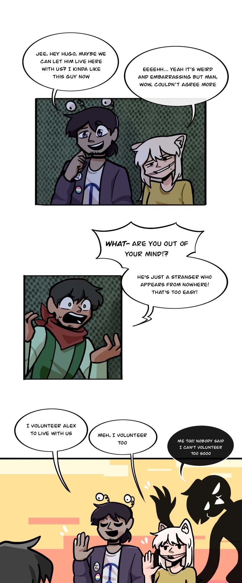 Alex, Kuchi, Hugo, and Leo, aren't heroes of this story or anything, just homeless folks, broken nobodies who try to survive in this messy society, crimes, cops, nonsense logic, who knows what could kill them(real life is horrible), maybe with illusion dark magic. "When pizzas aren't cold, there is always room for us"