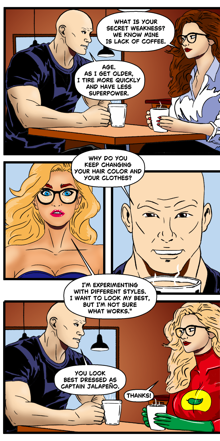 But a darker threat looms. The sinister Pale Face, ever the mastermind, hatches a diabolical scheme to sap Captain Jalapeño’s powers by tainting her beloved vanilla sweet cream cold brew with decaf. As the stakes skyrocket, Glabrous Man’s wit and Jalapeño’s caffeine-charged fury are pushed to their limits. Can they uncover Pale Face’s plot and restore the brew before Oklahoma falls? Dive into this pulse-pounding comic series, where epic battles, shocking revelations, and a steaming cup of courage collide!
