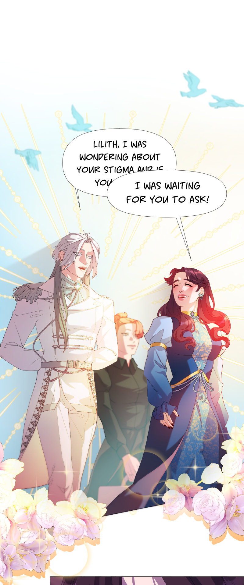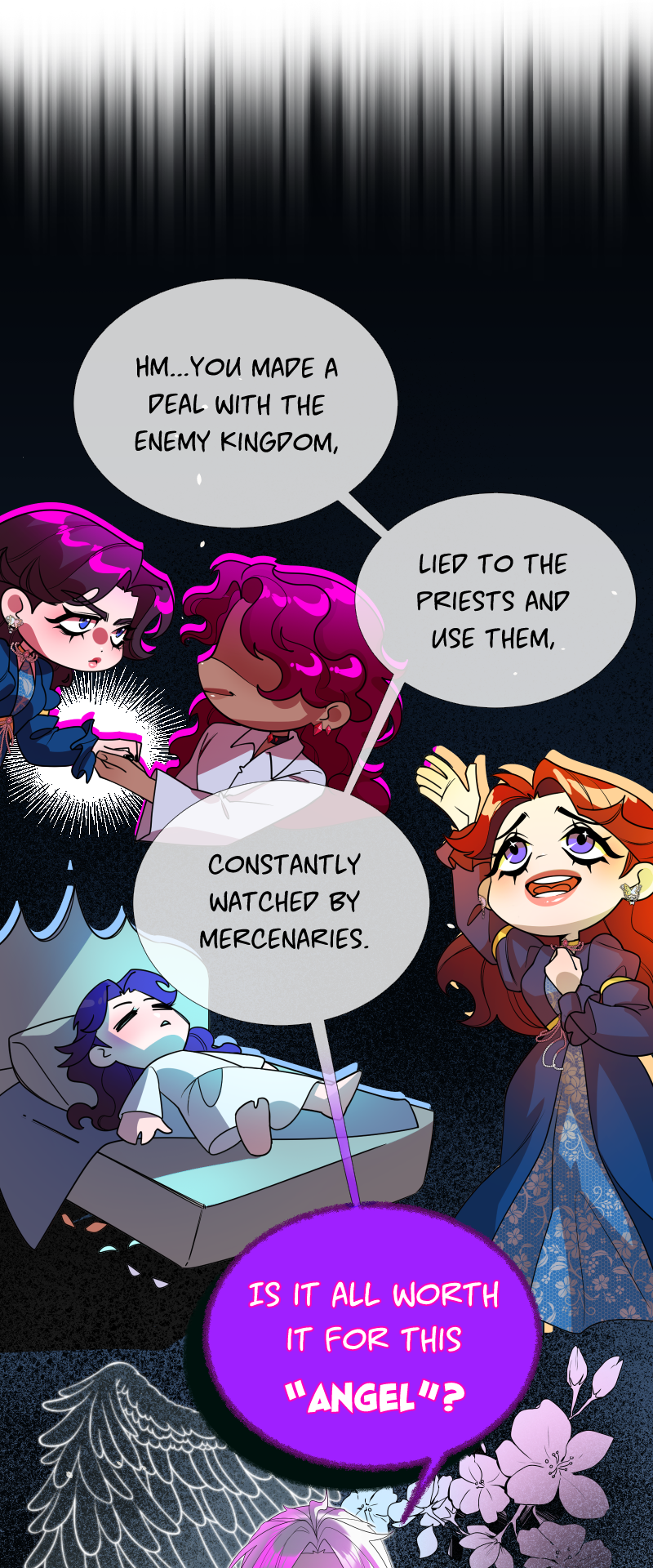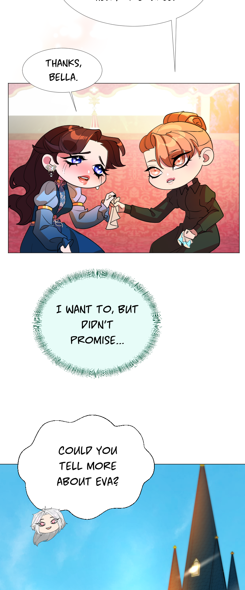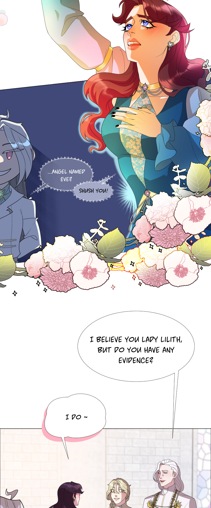 Lilith: "I read a short story about a princess. Is that corny? Yes, it was. Guess what happened next...I woke up with a dagger to my neck. The prince is plotting against me, and the church is happy to have a new saint. I'm facing death and..."