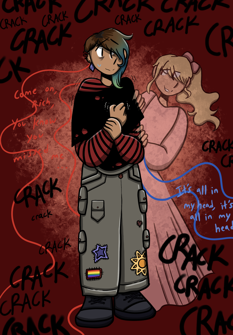 Sooooo... this is an artwork I'm pretty proud of! This is my character Rich, and the ghost who haunts him, Cecelia. They both used to live in a town that was under a curse, and they were in love. But when they were teens, the curse began to affect Cecelia heavily, spiraling her life off track and causing her to fall into dark and violent delusions. Rich made it out, but Cecelia didn't. Years later, Rich is part of a team of kids trying to break the curse over the town and stop it from spreading to the rest of the world. He thought that he would never have to see Cecelia again, but her ghost comes back to haunt him. He thinks he's imagining it and does his best to hide it from everyone around him... but it's only going to get worse from here.