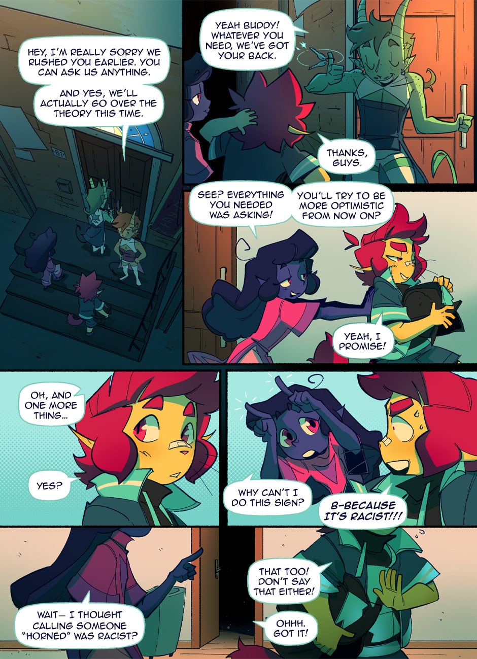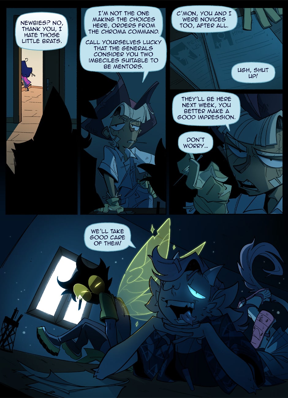 In a world where pride flags are worn as capes to fight for justice, Theo and Vee are two young novices ready to start their training to become professional sentinels. But every rookie needs a mentor, and who better to show them the ropes than the most catastrophically dysfunctional sentinels in the entire city? BE GAY, FIGHT CRIME!!!