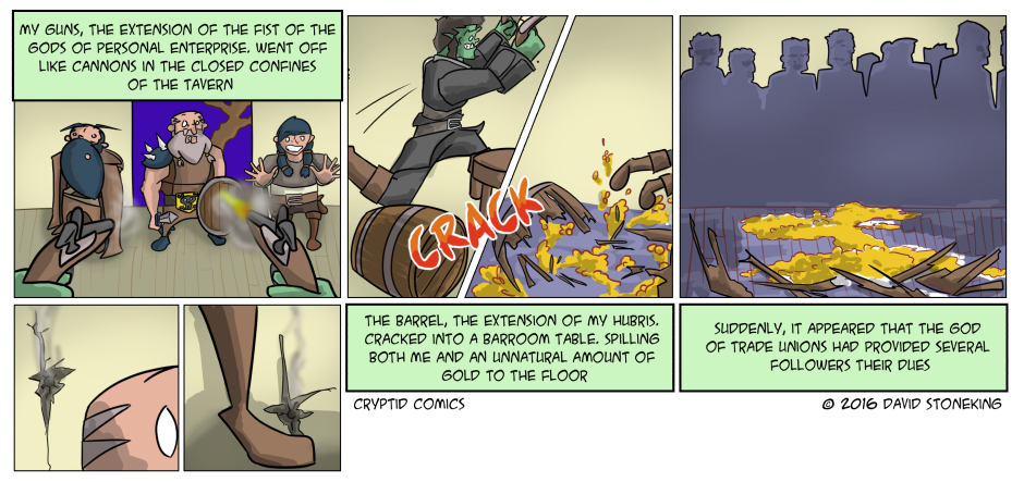 It occurs to me, Rumscum may be behaving needlessly violent. It's worth noting, this entire series (Scumport) is based off of the actions of my actual players in a game of DnD 5e. So there are moments where things get a little "murder hobo'ish". Sometimes, as GM, I tend to get a little too permissive.