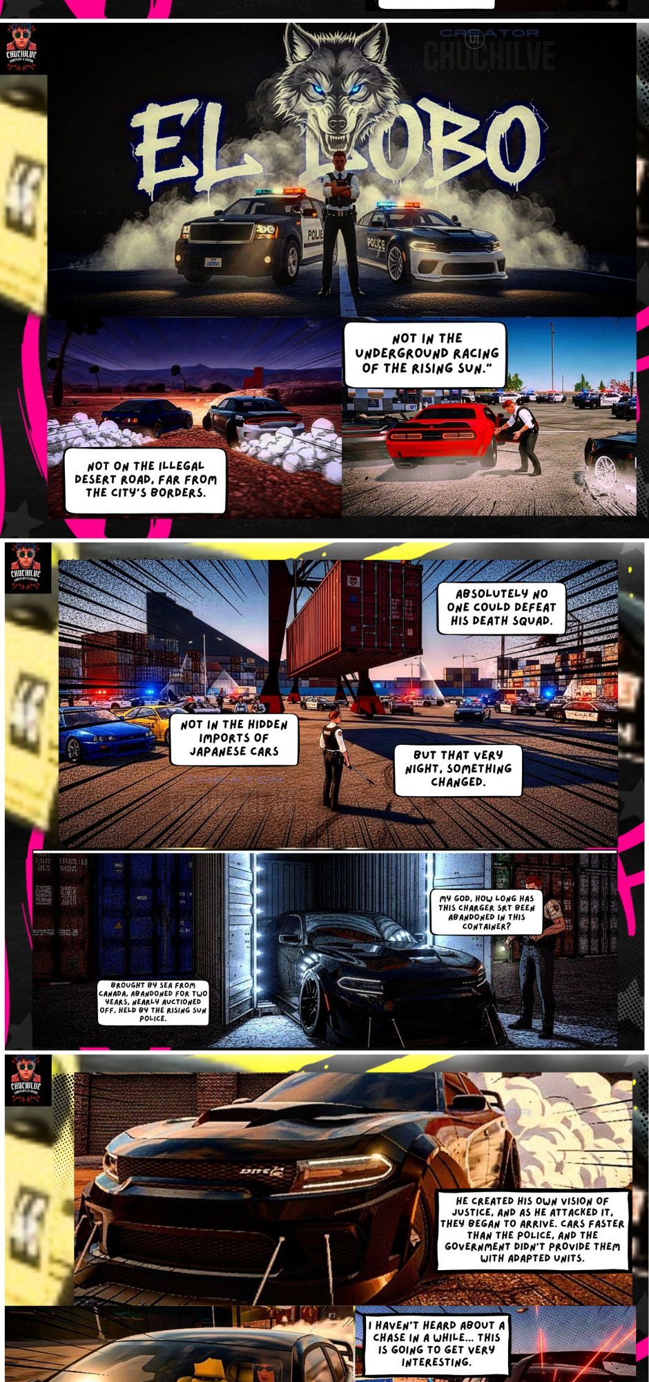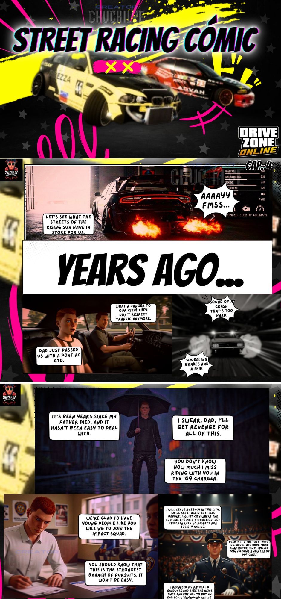Chuchil is disappointed with his past and accepts his friend Bubu's invitation to travel to the City of the Rising Sun without knowing how much his life was going to change. He accompanies the protagonist in a story of sports cars, vinyls, races, crashes, romance, action and a lot of love for automotive sports.