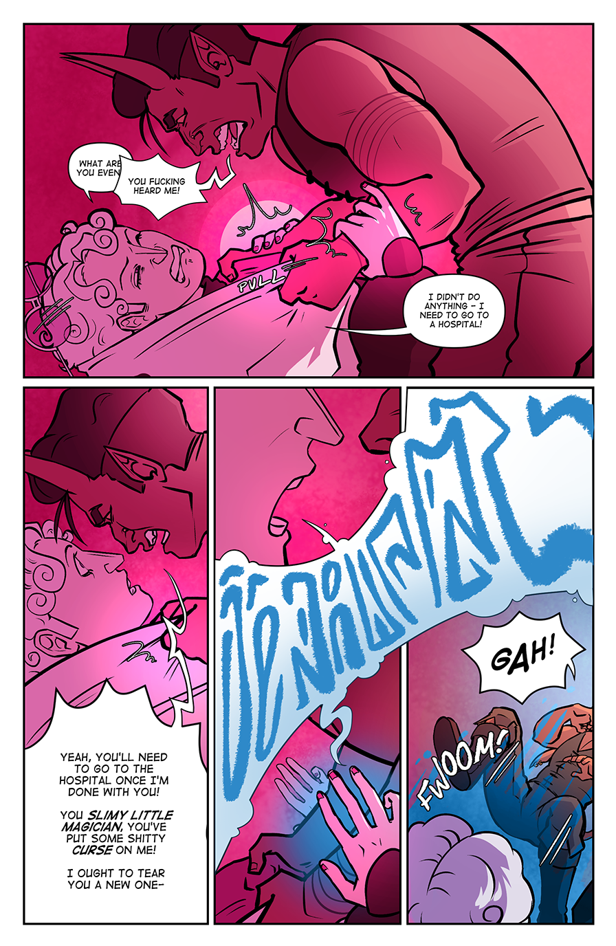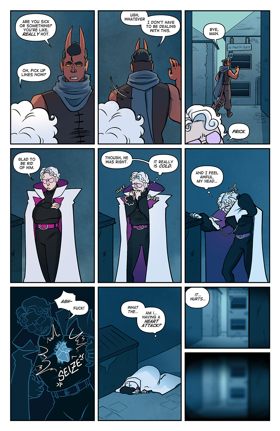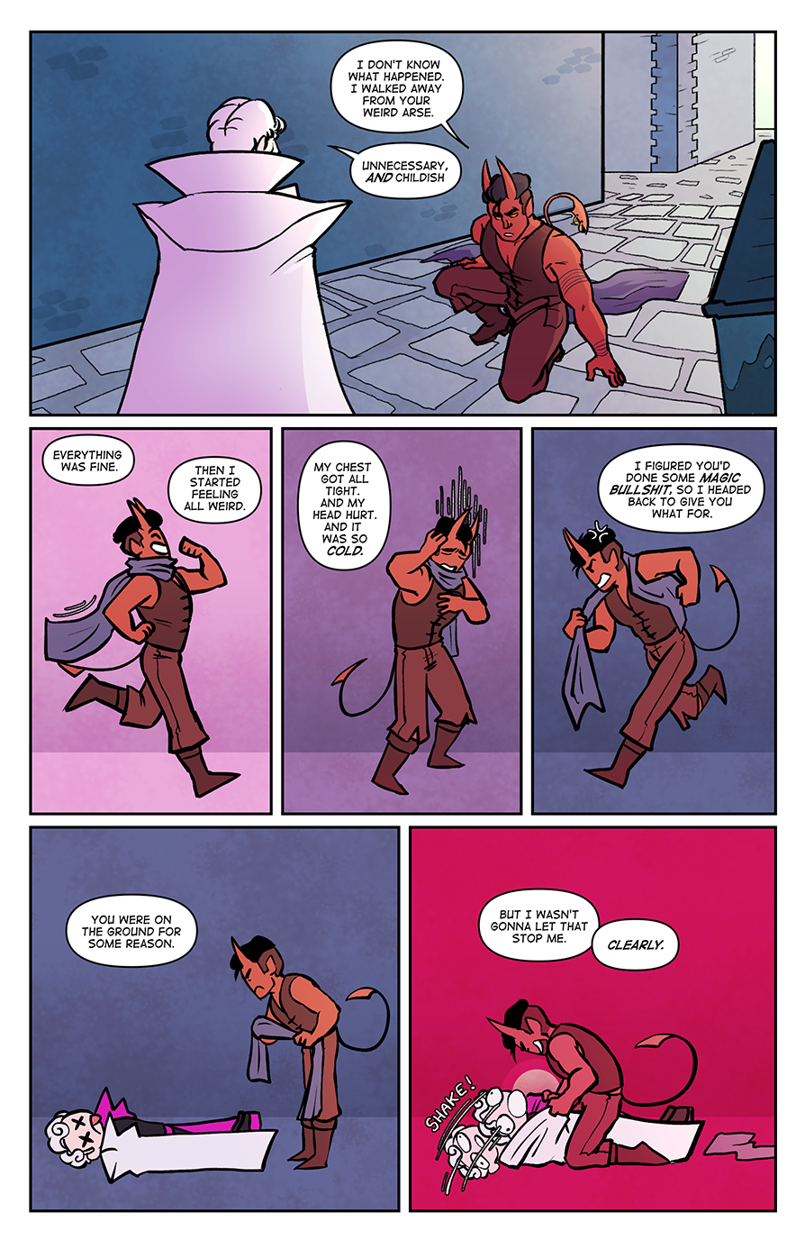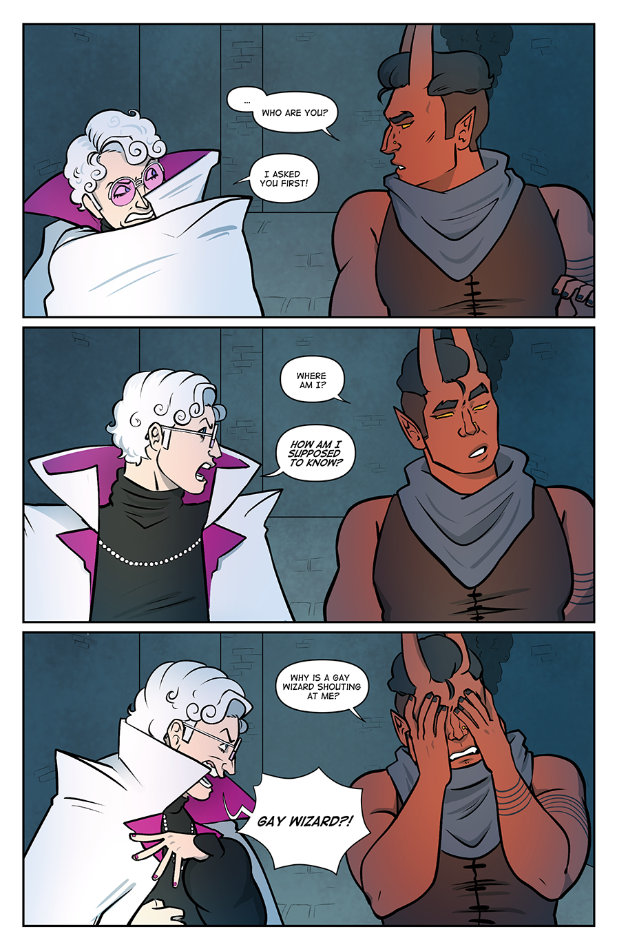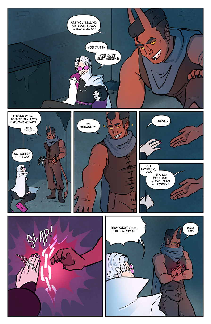 Spite Bound is a romance, modern(ish) fantasy comic about Johannes and Silas, two men who should know better. Full of slow-burn, enemies to lovers tropes, witty comedy, and frustratingly dense men, Spite Bound is inspired by the worlds of various TTRPG's and fantasy comics.