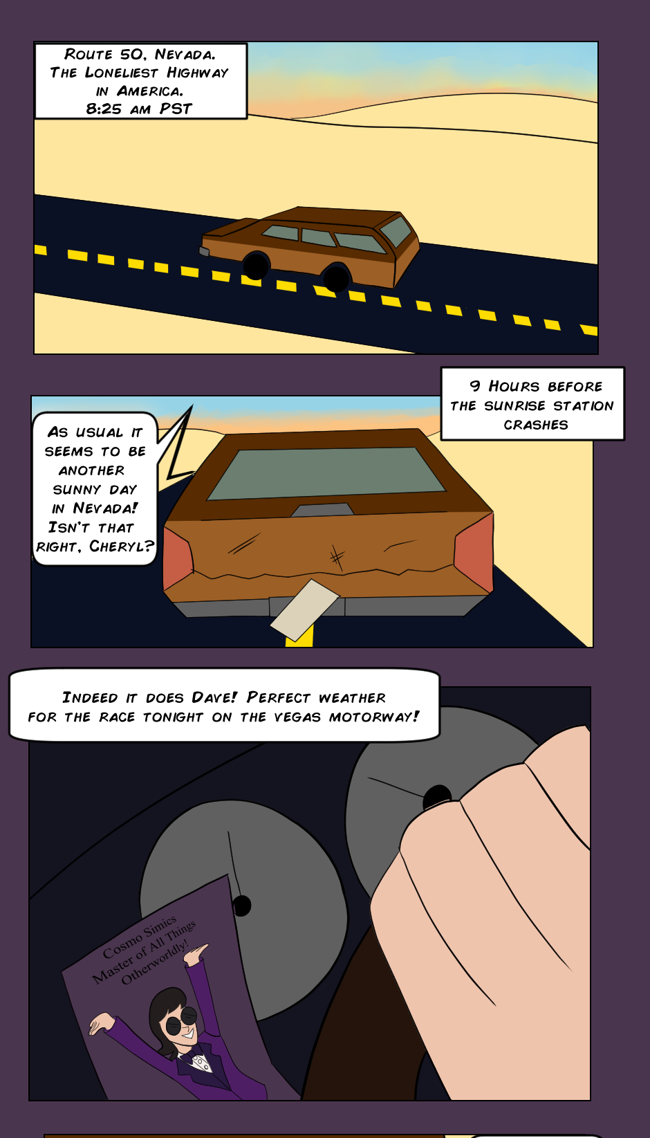 Page 1 of chapter 2! Introducing another of the main characters, Cosmo Simics! I'm sure you can guess his deal. I've got plenty of pages loaded in the chamber so I hope to be way more regular with this chapter. I know I havent uploaded in a very long time and im sorry about that. to the 18 other people who even read this I promise to be more disciplined this time around. To never giving up!