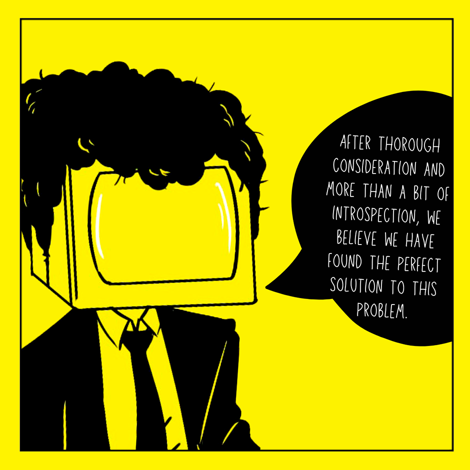 The TV Heads are the primary workforce of the megacorporation Grand Achat in the post-alien-invasion wasteland. They're stuck in one of the only "stable" jobs left, a role described as soul-crushing and severely underpaid.