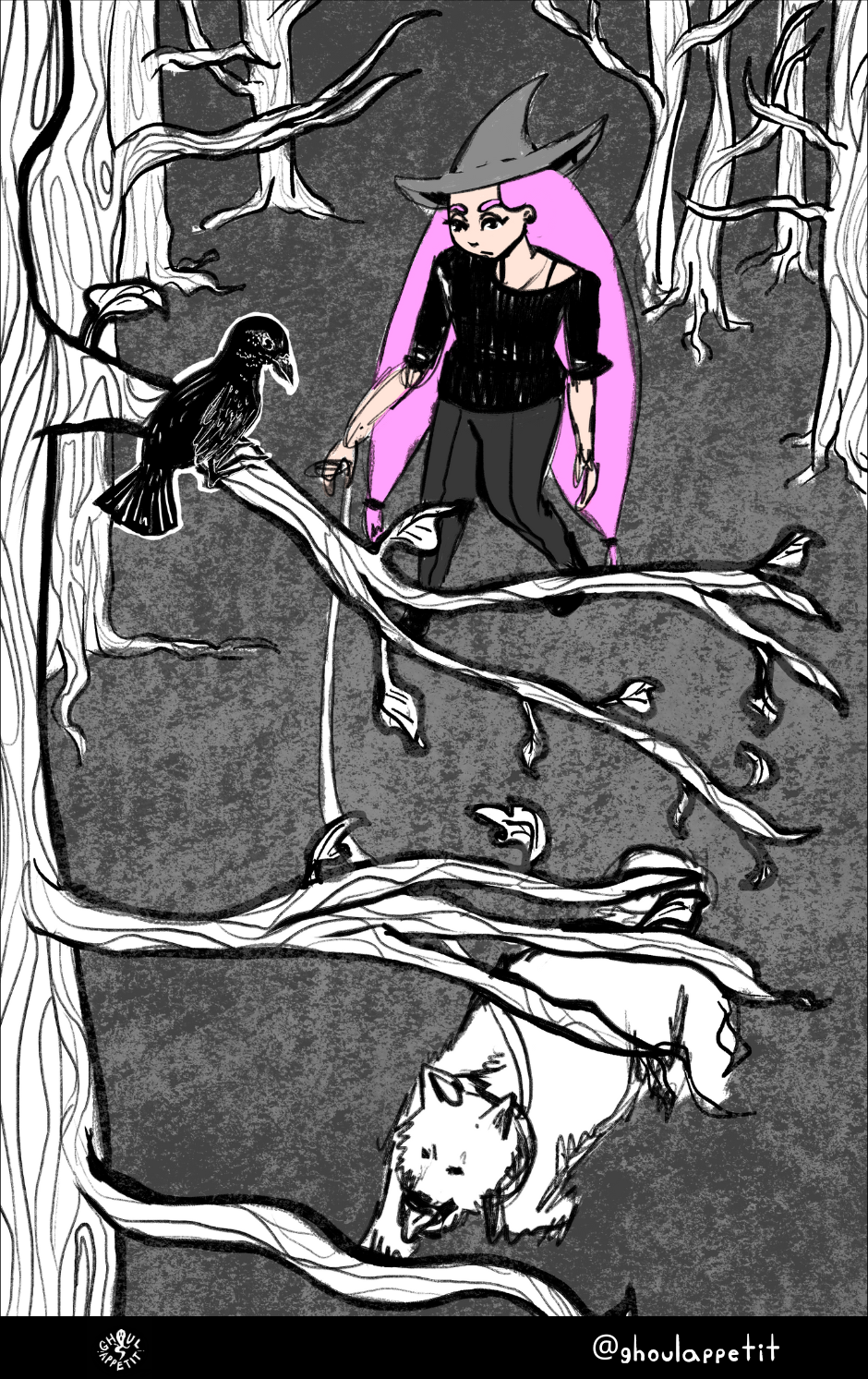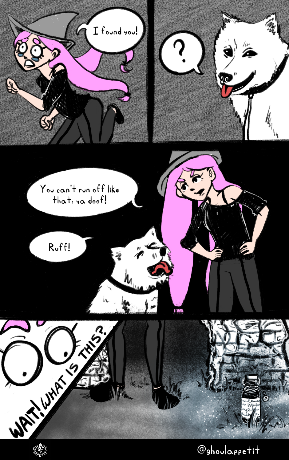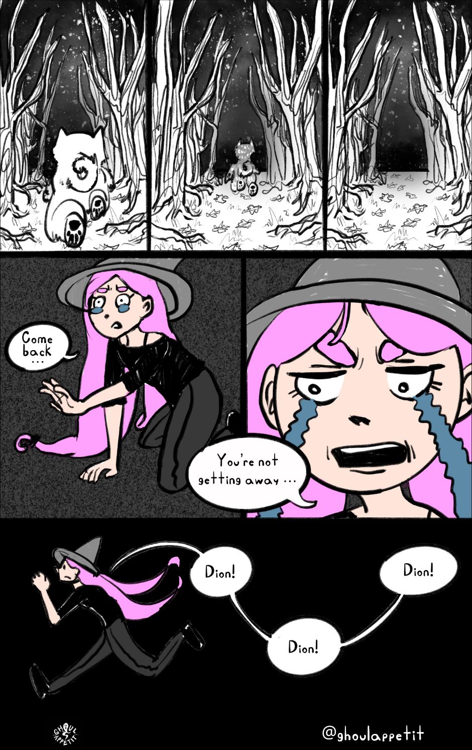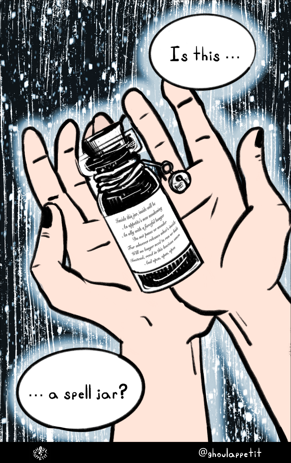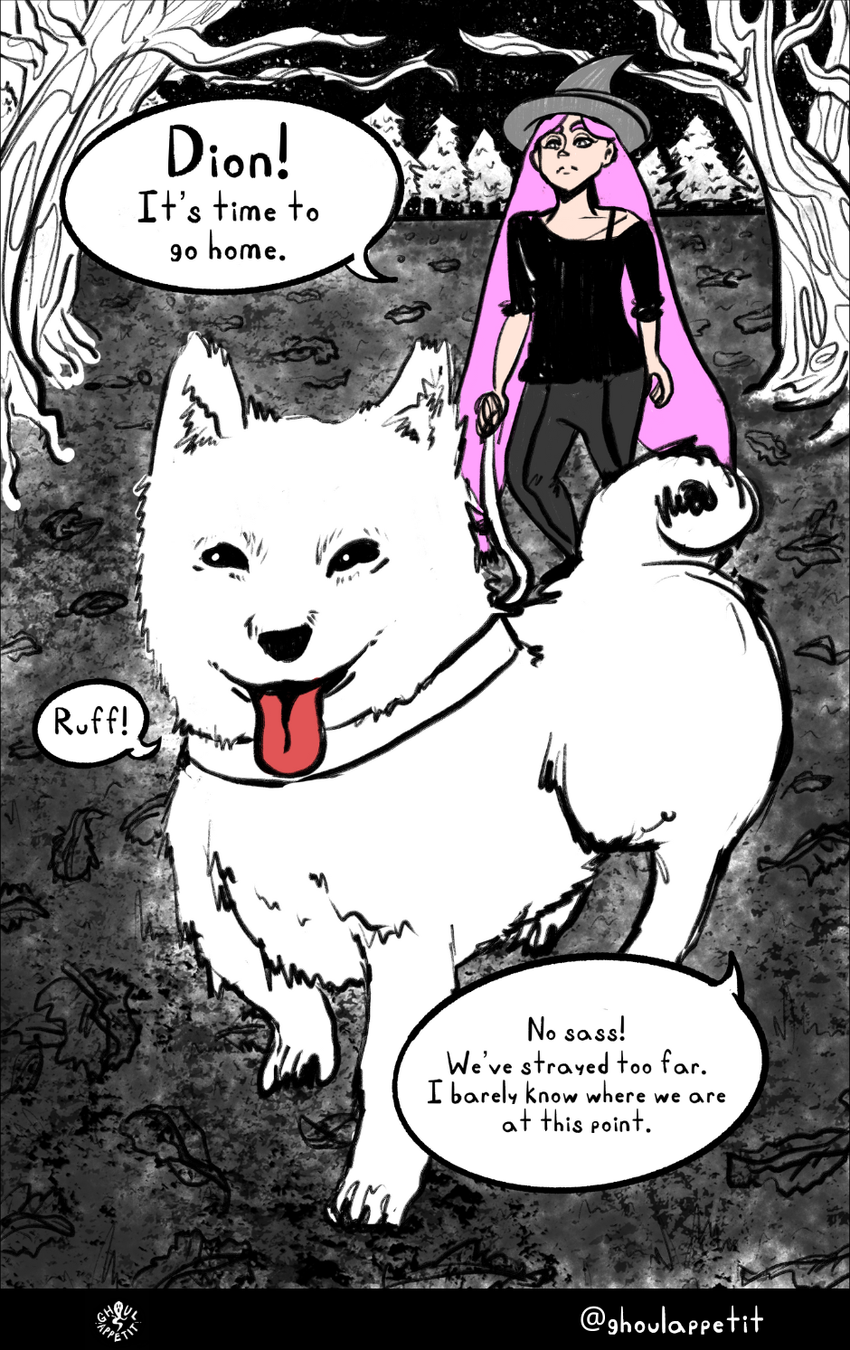 Ghoul Appétit! is a "slice of magical life" story that is an angsty, goofy, and witchy coming-of-age webcomic that seeks to reflect on how food can be a means of self-understanding and connection with others.