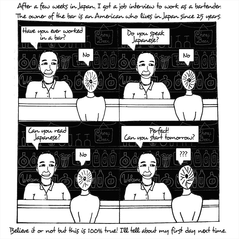 My first job interview in Japan for a work as a bartender. I still don't know why he choose to hire me... ahah I should have posted it before my previous comics about me working in the bar, but... well. ^^