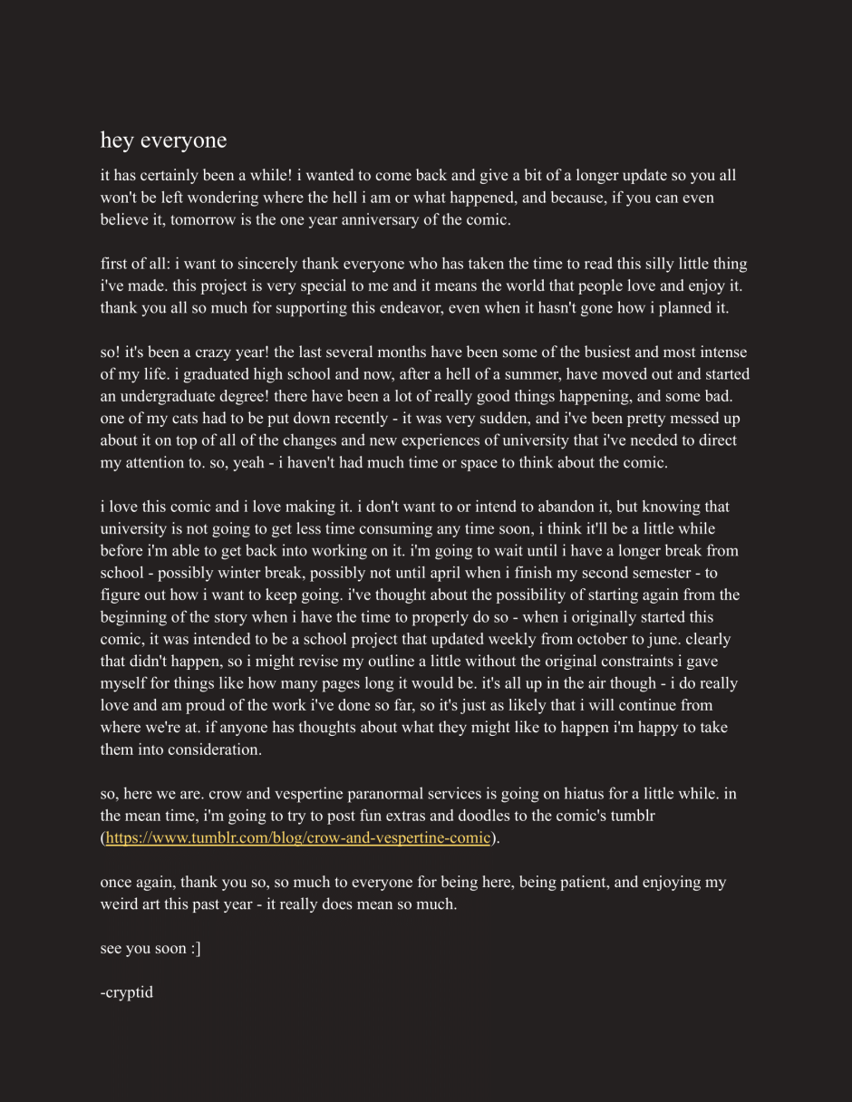 so yeah, as said the comic will be on hiatus for a while. i do intend to come back, but that won't be until i have a longer break from university. i'll keep posting little extras and doodles on the comic tumblr (https://www.tumblr.com/blog/crow-and-vespertine-comic) so it won't be complete radio silence until then.