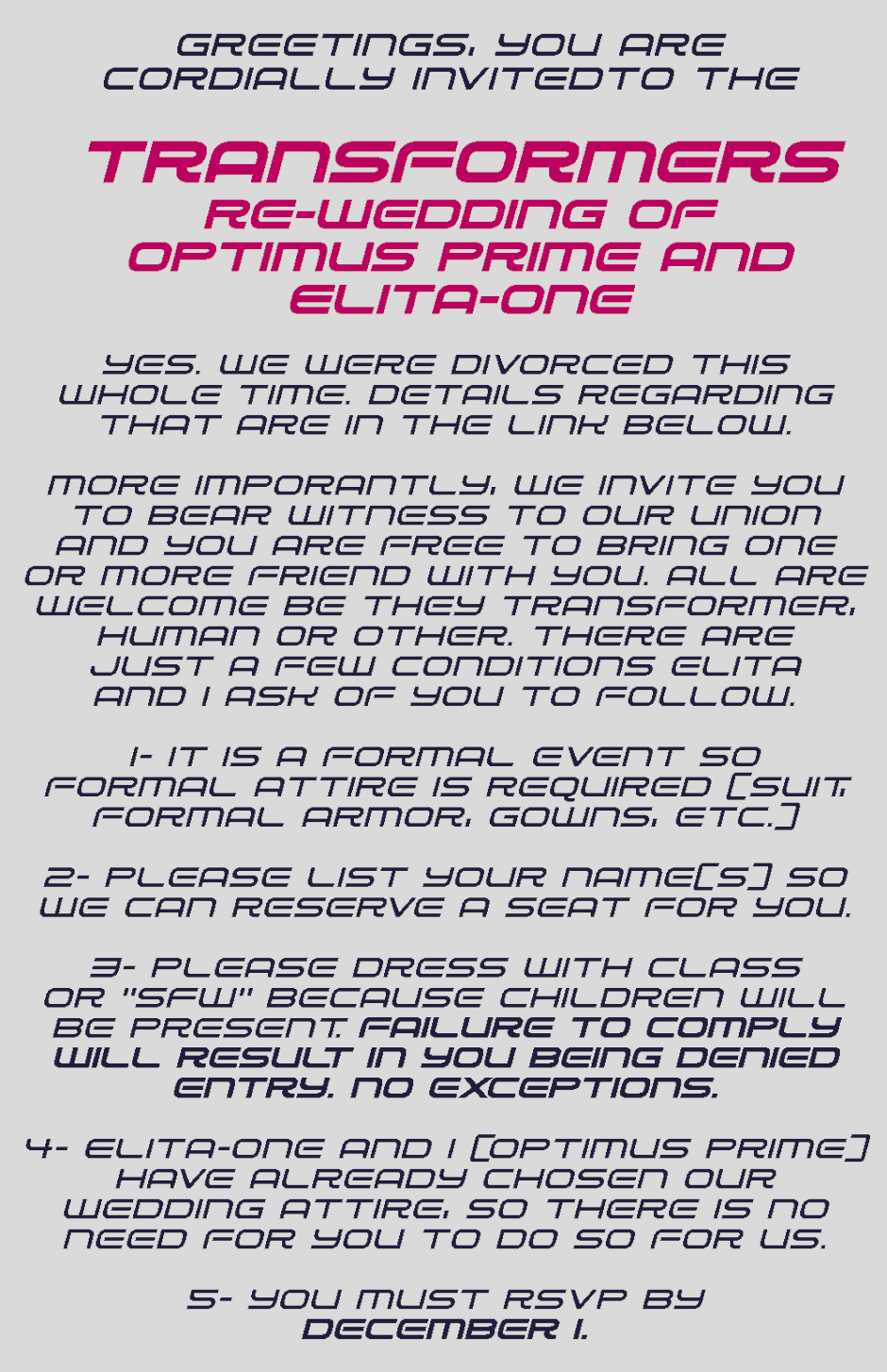 War drove them apart, but peace brought them back together. Four years after Autobots and Decepticons finally made peace, Optimus Prime and Elita-One have decided to remarry and have the wedding they always dreamed of having, but while all drama in their relationship has been addressed, it still seems to attract a lot of drama as well as hilarity.
