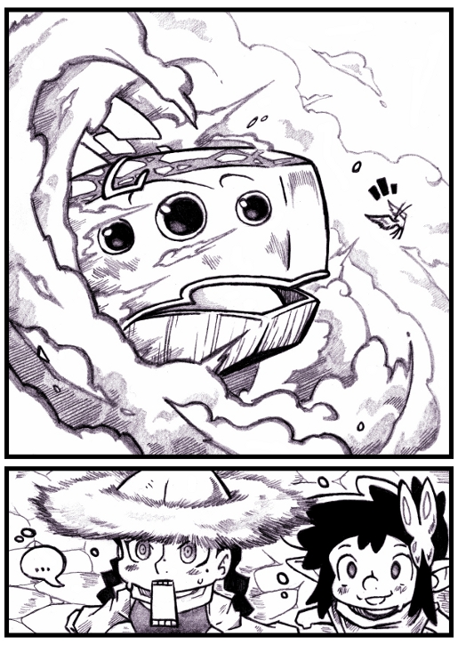 Act 1: La... ballena, o eso parece, se acerca volando al pueblo, y Zune prepara una flecha por si acaso, pues no sabe qué intenciones trae (no tensa el arco, no es bueno mantenerlo tensado). Pero parece que Shal sí se hace una idea de qué viene volando hacia ellos... y le parece maravilloso ❤️
