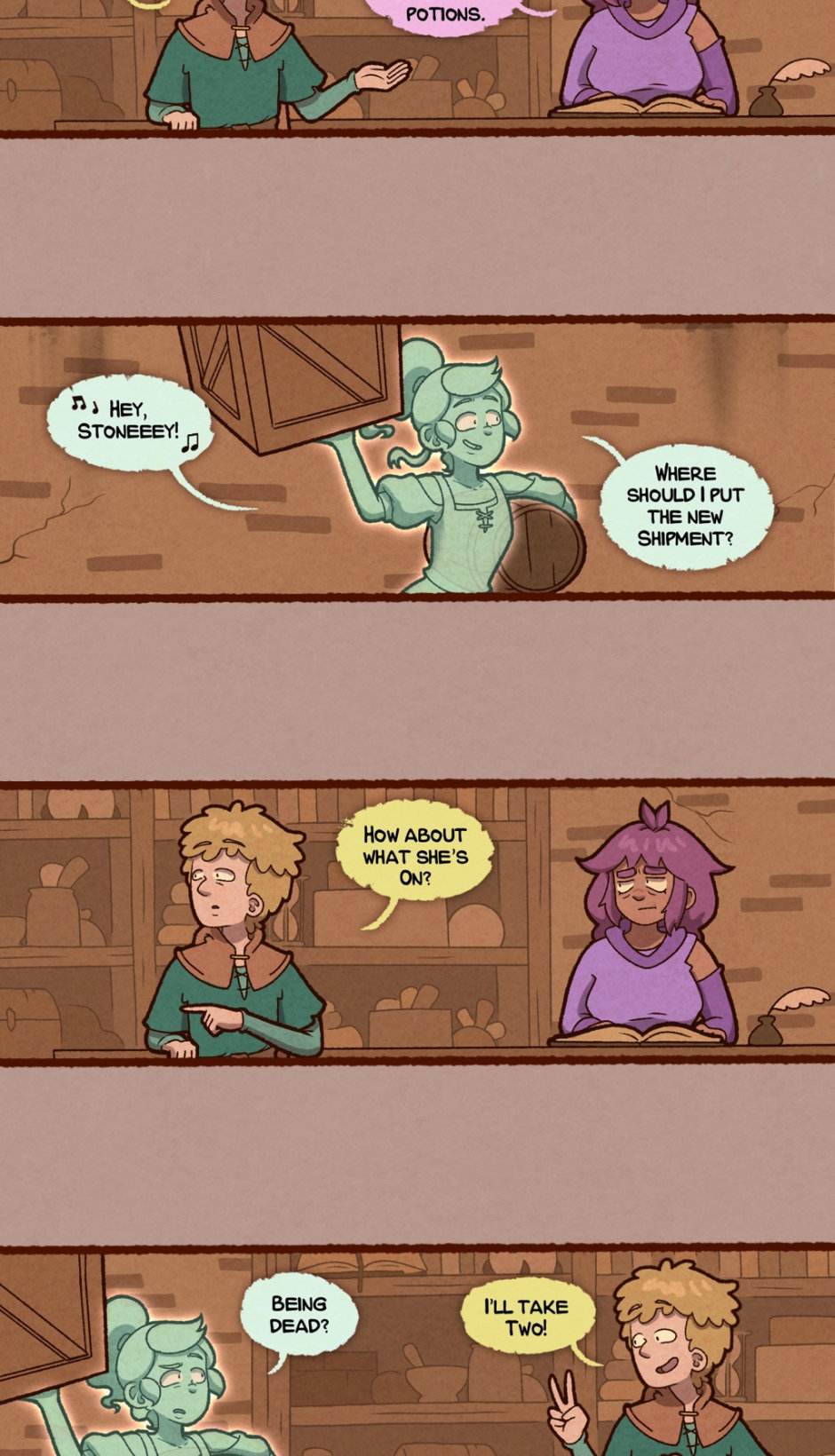 Wrenth "Stoney" Stonehouse spent her youth as an adventuring rogue, but has traded in her daggers and lockpicks for a simple retirement running a general goods store in the crumbling district of Briarfold. Her plans to quietly fade off into the shadows are thwarted when the ominous spectre haunting her shop turns out to be Vintaria Halloway, the persistently upbeat and chipper ghost of the building's former occupant. Can Stoney manage her business, her unique new employee, and her past?