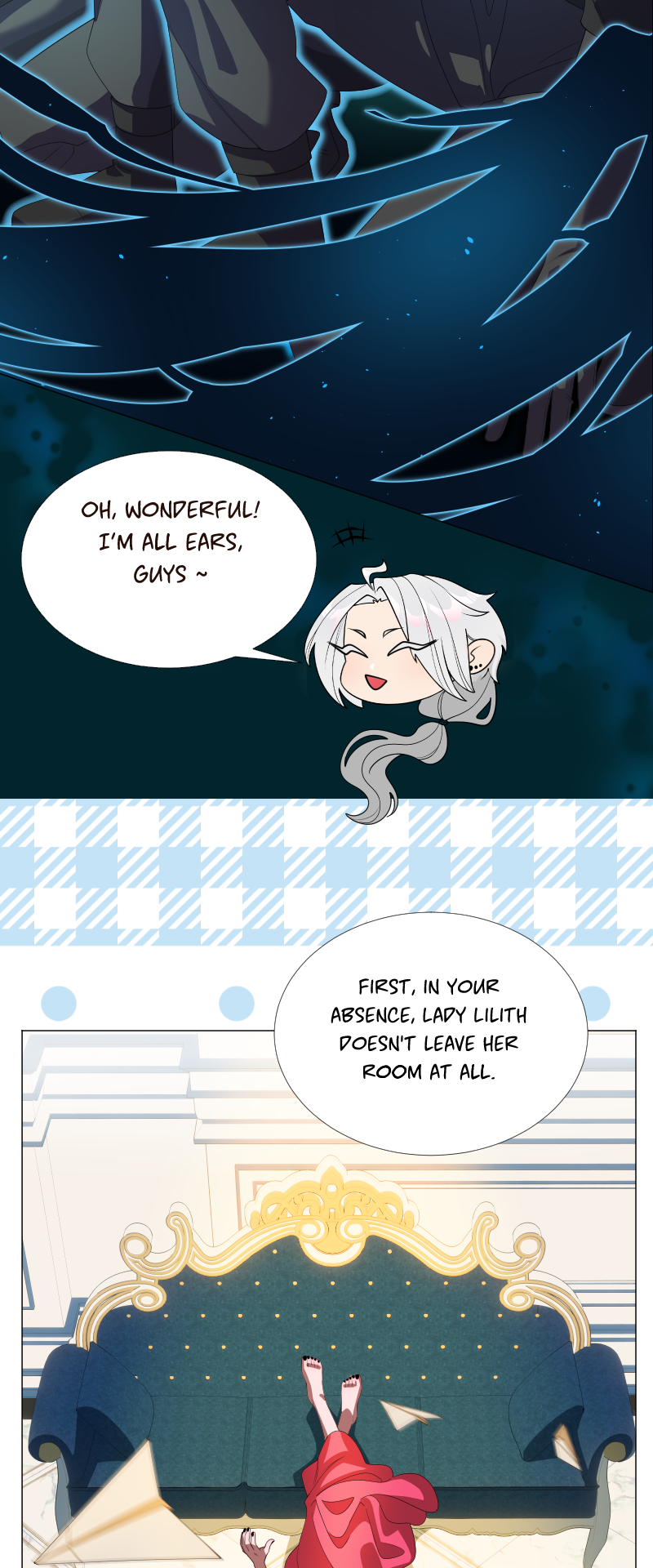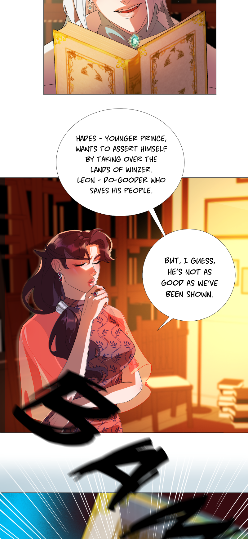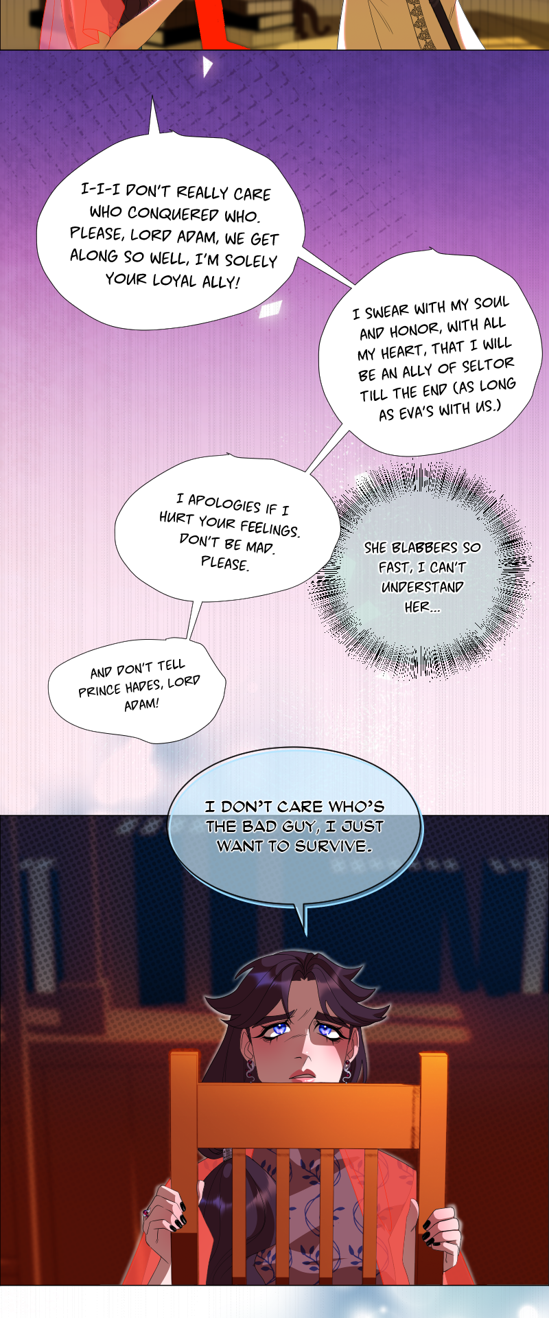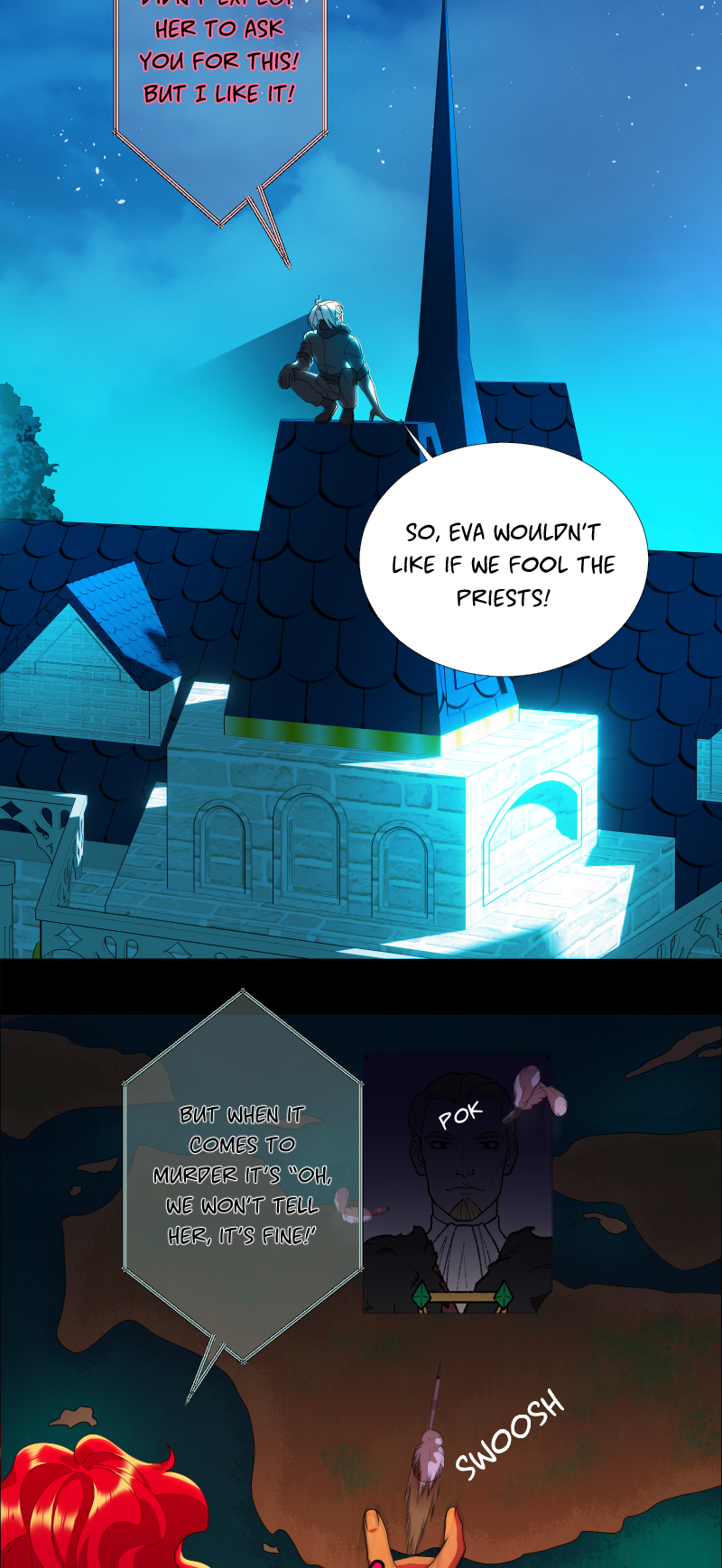 Lilith: "I read a short story about a princess. Is that corny? Yes, it was. Guess what happened next...I woke up with a dagger to my neck. The prince is plotting against me, and the church is happy to have a new saint. I'm facing death and..."