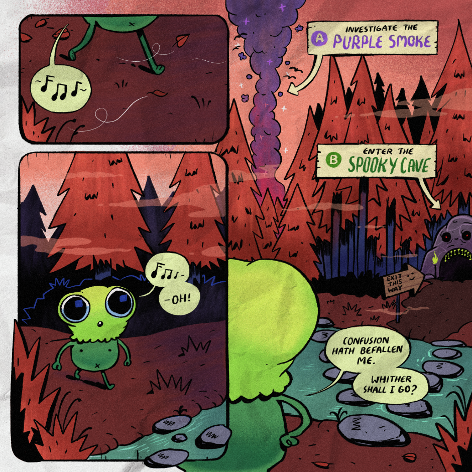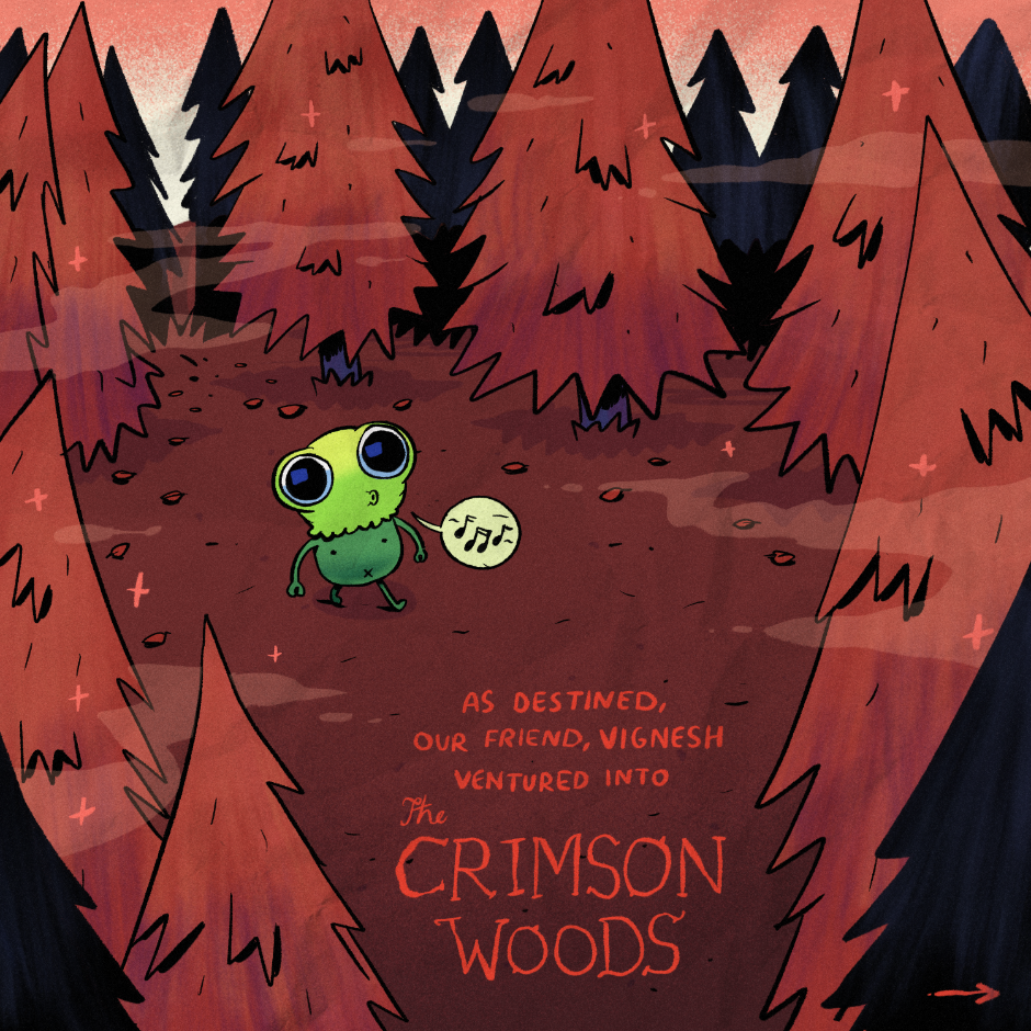 A fun choose-your-own-adventure style interactive web comic! This tale follows Vignesh the travelling forest creature as they travel through the mysterious lands with the help of you, the reader!