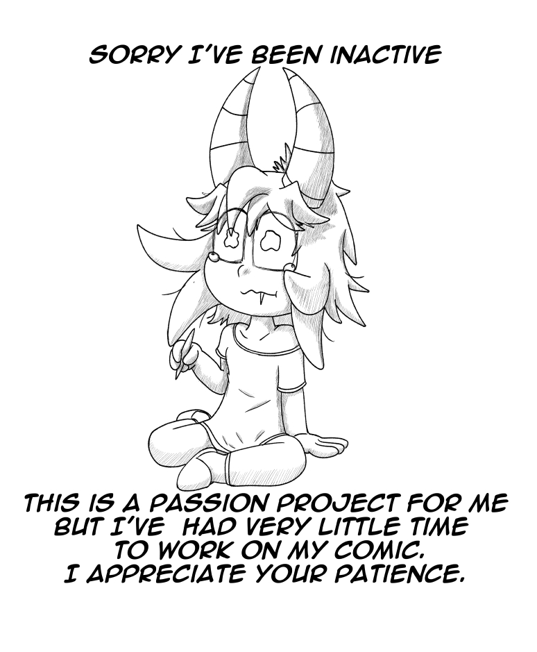 I apologize for the lack of uploads. Being a freelance artist doesn't give me a lot of free time to work on my comic. I have been making steady progress on the next two pages, and I'm currently working on my approach to get pages out quicker. I am also going to try and hire some help for cleanup and sketching. Thank you so much for your patience. ^^