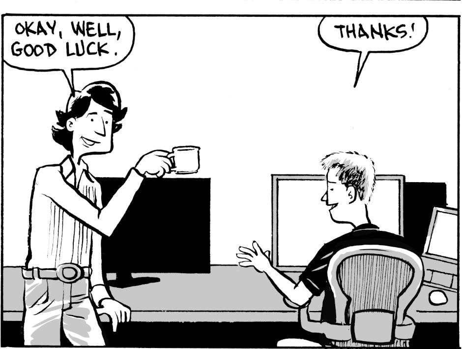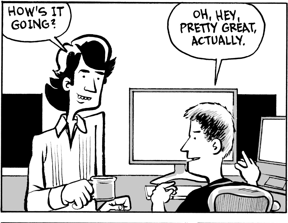 Meanwhile, as extravagant office perks and parties provide the appearance of a fun workplace, he and his co-worker Pete become like ghosts, wandering the office but prevented from doing anything of value.