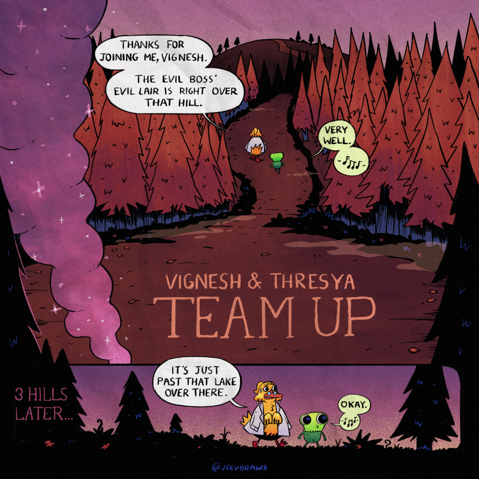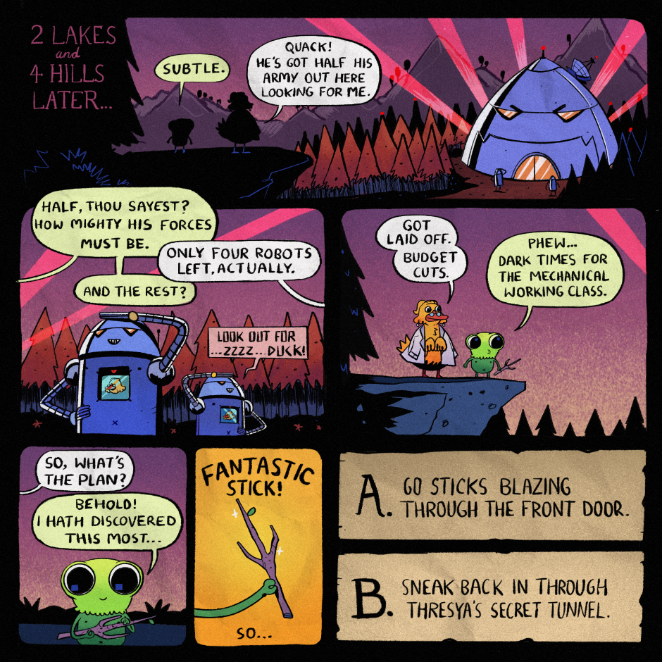 A fun choose-your-own-adventure style interactive web comic! This tale follows Vignesh the travelling forest creature as they travel through the mysterious lands with the help of you, the reader!