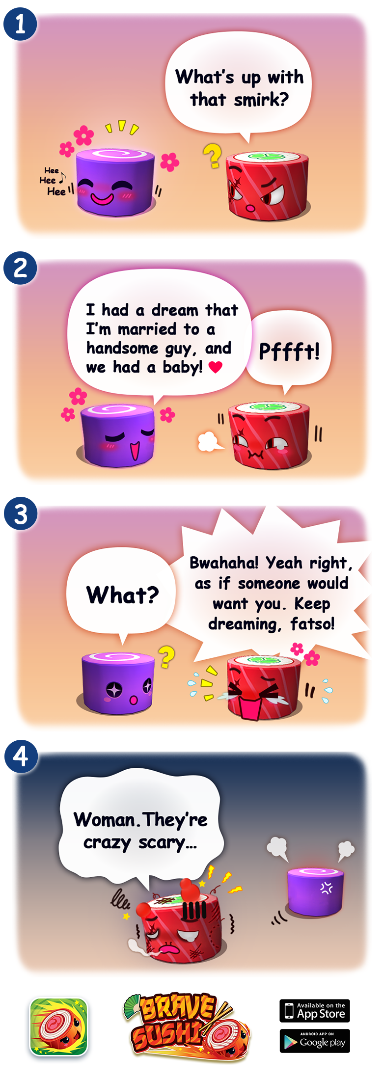 Brave Sushi is our first run on 3D mobile game. Help guide your sushi across the endless conveyor in an attempt to escape his inevitable fate. Jump, dodge, and slide your way to survive as long as possible, with the occasional help from flavouring powers!