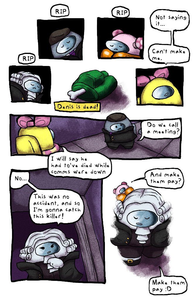 Hello! This is a small comic series revolving around my friends in our Among Us discord server! In issue #1 "Hamilton's Play" Hammy becomes a detective to solve the murders of her friends. Can she catch the killer? Why don't you read and find out? :)