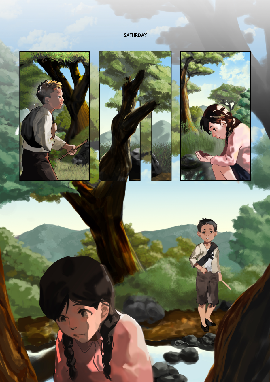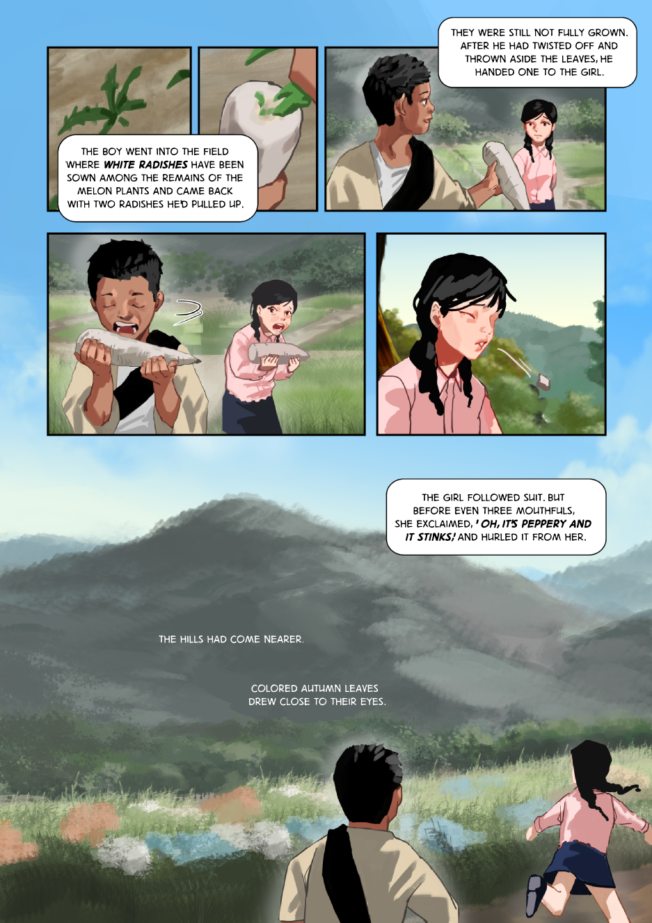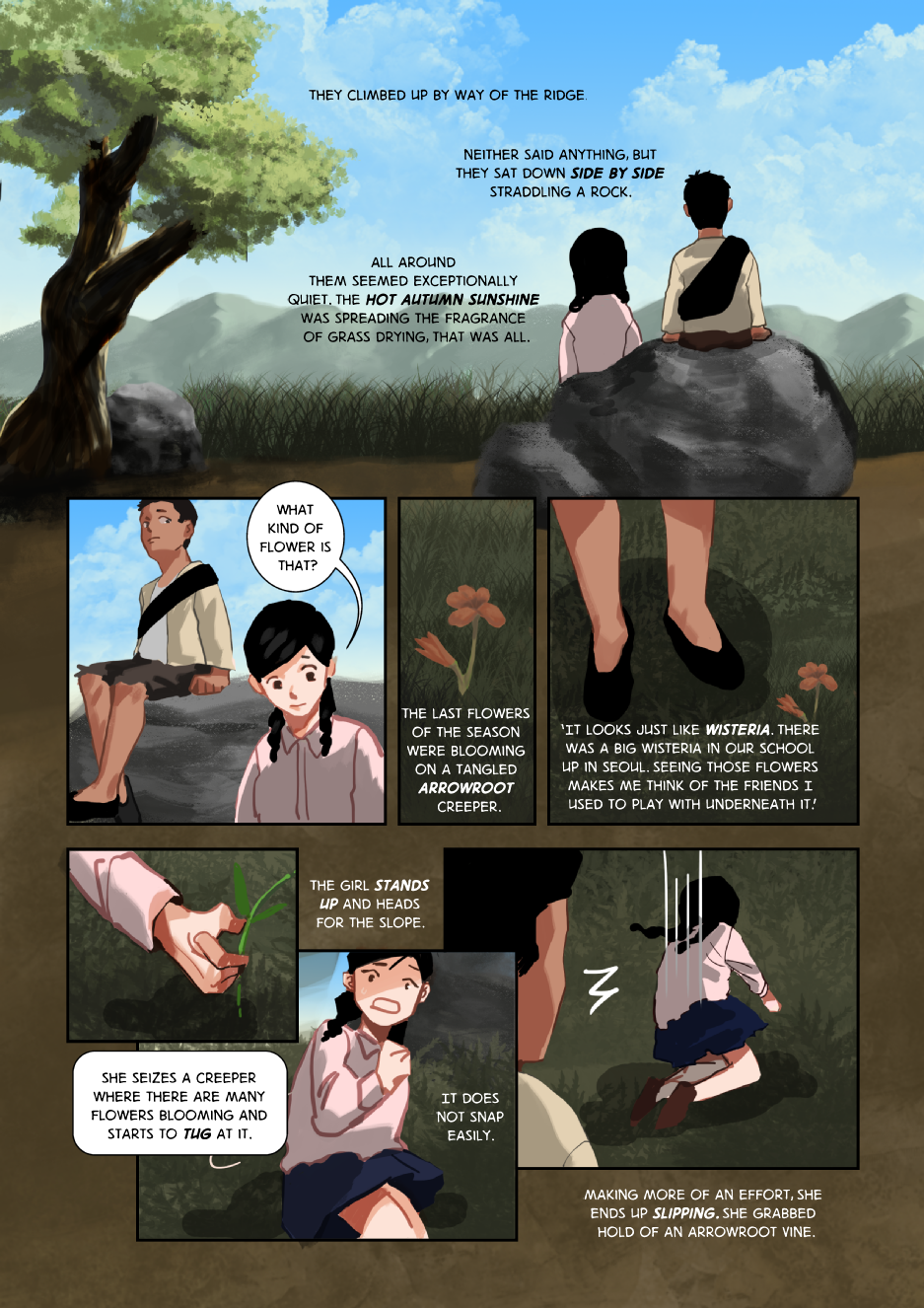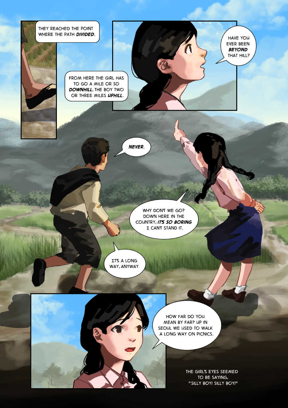 After the boy and girl meet, they set off on an adventure across the Korean countryside. Although the war was devastating to the land, there are still areas of exquisite beauty.