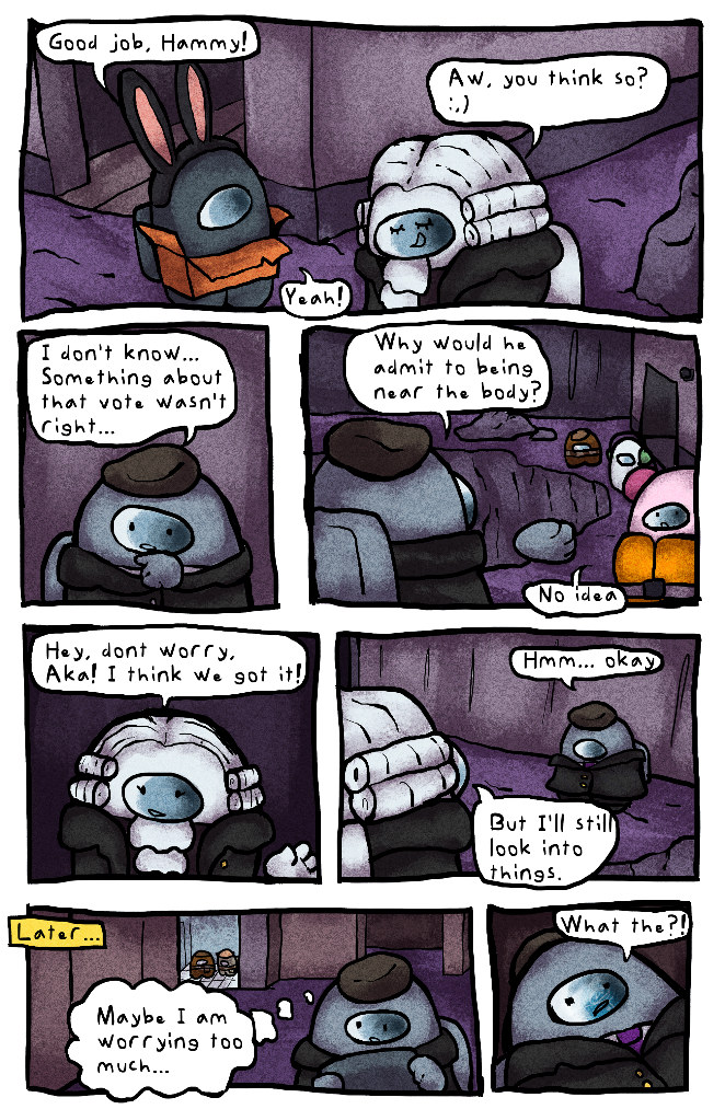 Hello! This is a small comic series revolving around my friends in our Among Us discord server! In issue #1 "Hamilton's Play" Hammy becomes a detective to solve the murders of her friends. Can she catch the killer? Why don't you read and find out? :)