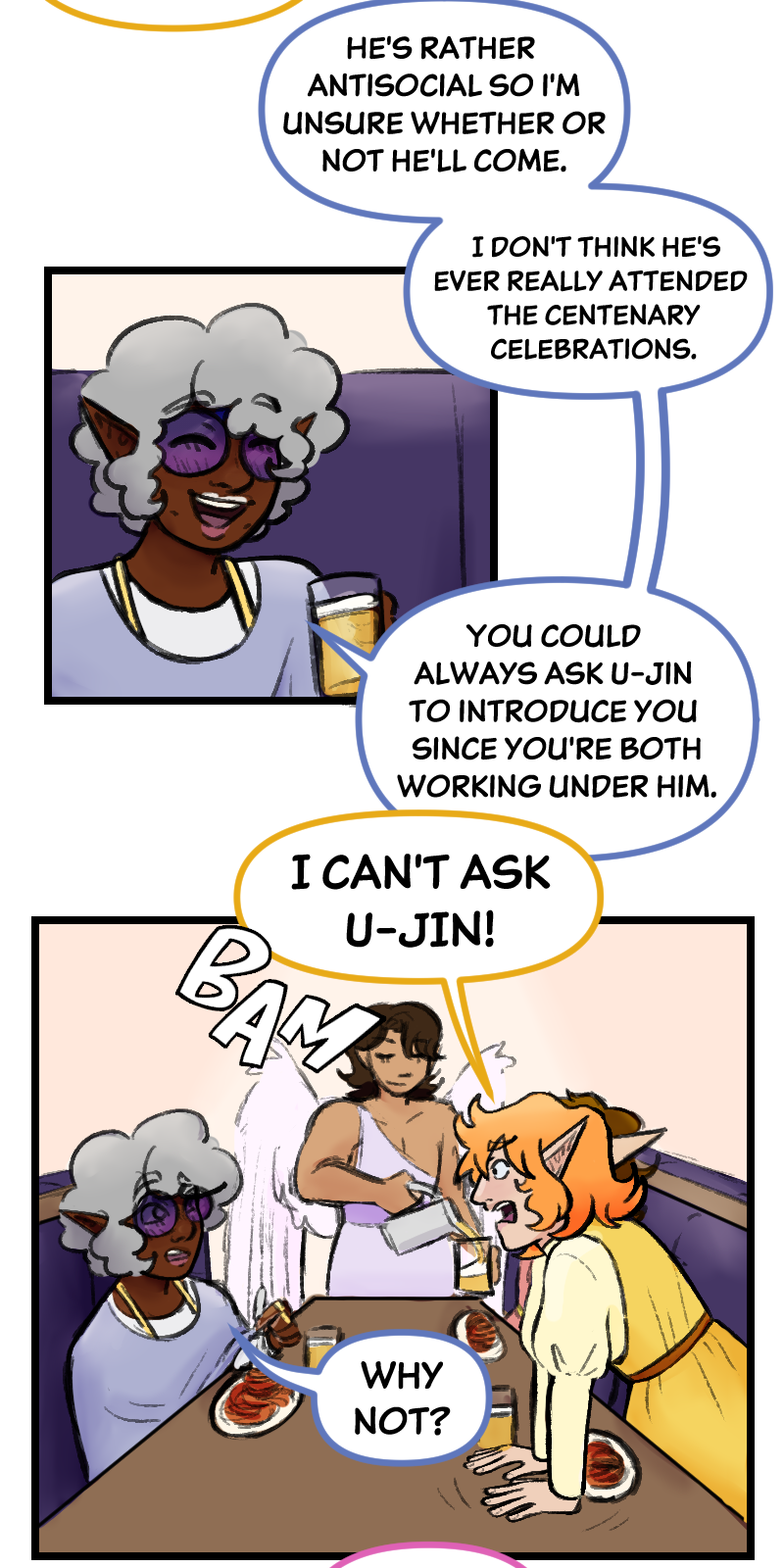 The Elder Gods of Heaven, the Gods of Space, Time, Life and the Underworld, are preparing for their Centenary Celebration, where all the gods gather to have fun and mingle for the turn of the century. Othni, the God of Time, is more focused on rekindling his relationship with U-Jin, the God of Space.