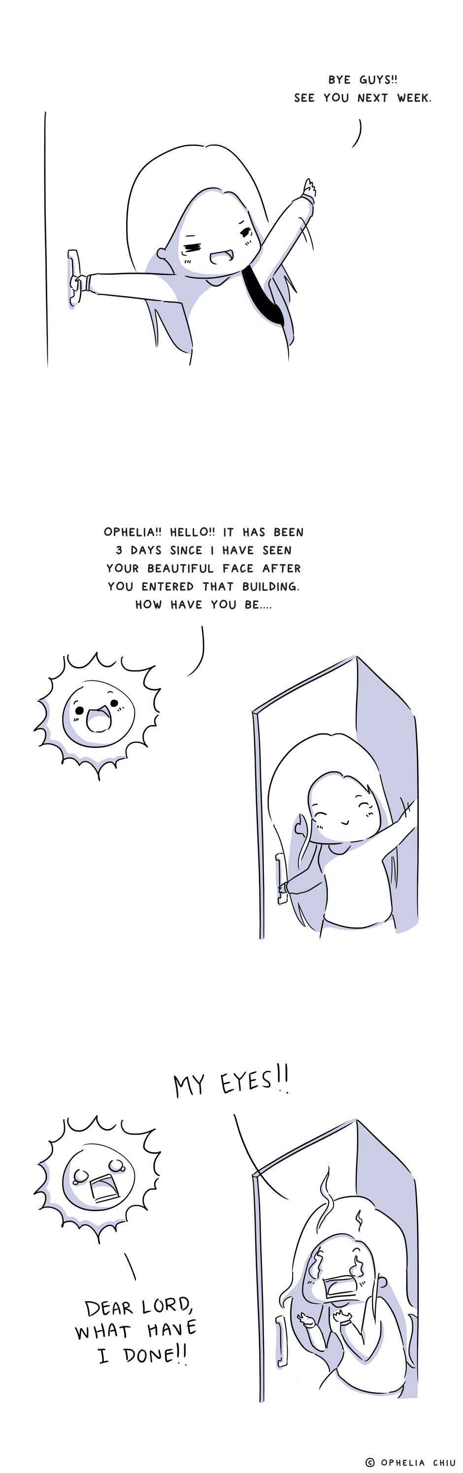 xD first comic I've seen where the sun feels bad for what it has done. I really cannot stand the pure sunlight my skin starts to itch so bad( even with sunscreen) and it kills my eyes which ugh I feel your pain T.T( your art style is adorable tho ^•^)