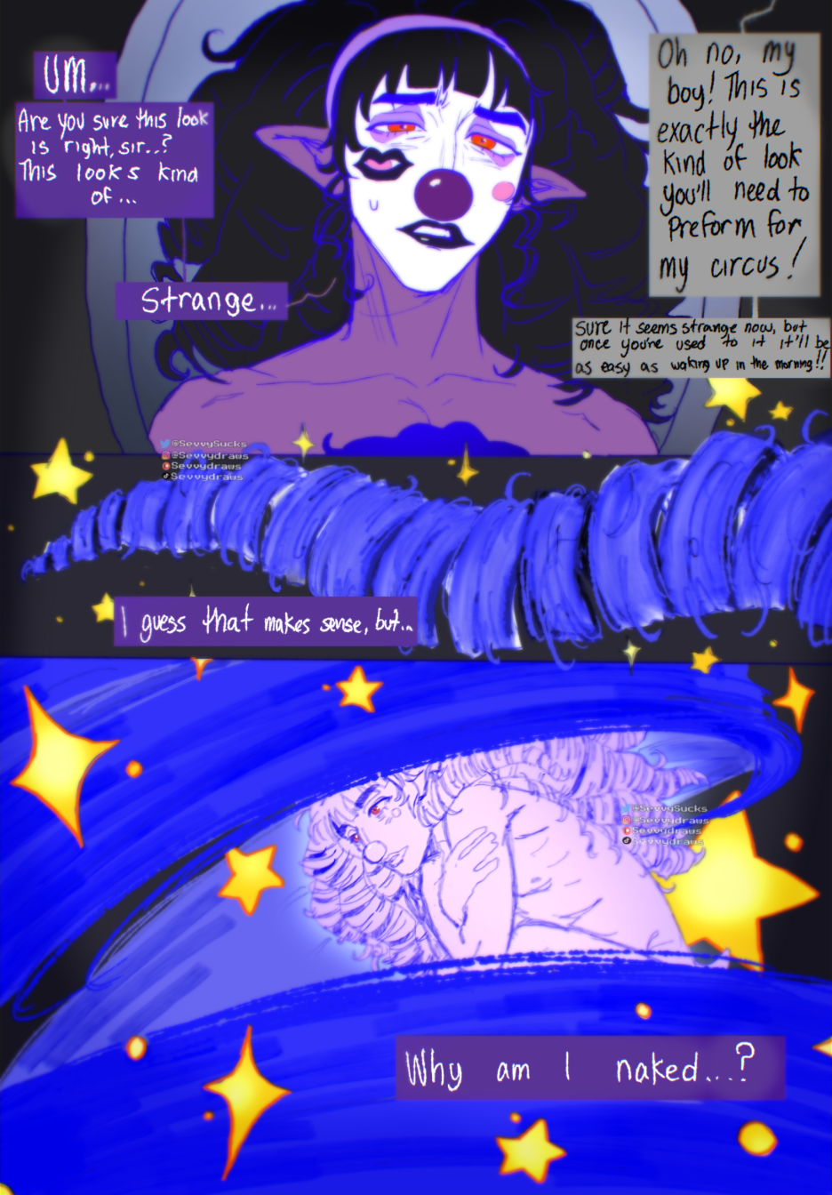 This is a series of lore that takes place throughout my character Lurch’s current life, dreams and memories. Since he is the only clown character of mine that has met all of my other clown OCs at some point, I decided he’s the perfect one to use to use for this story!