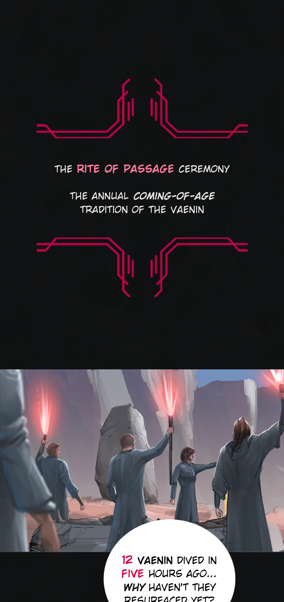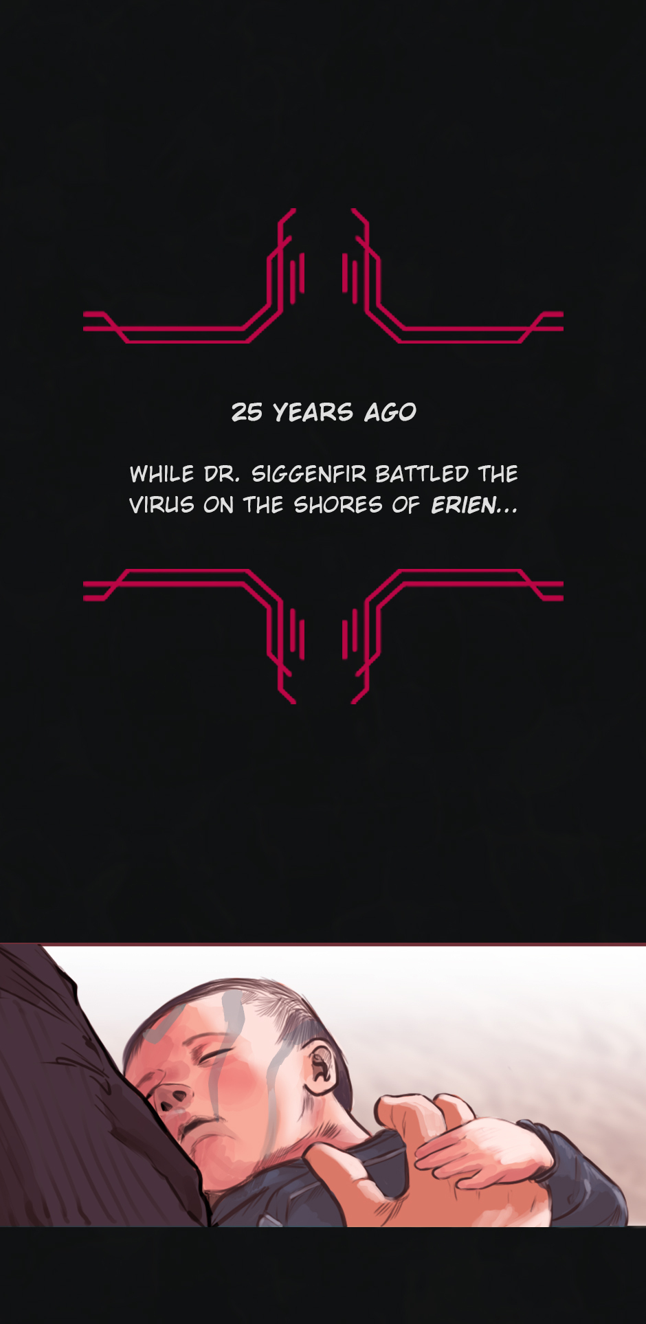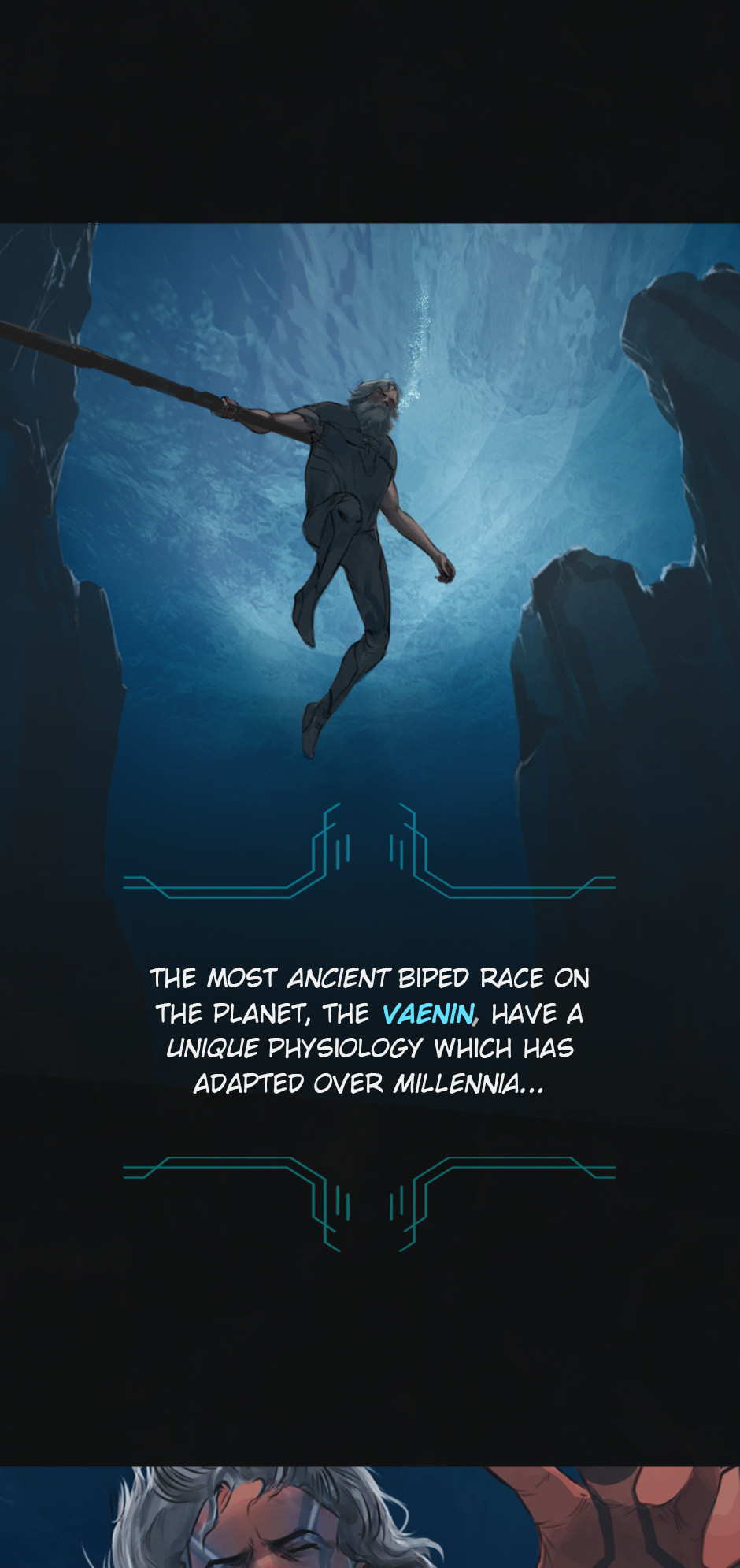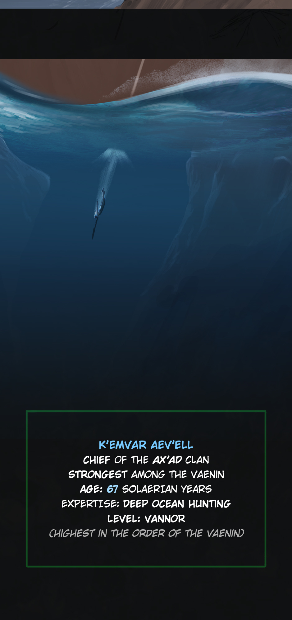 25 years ago. While the medics fought the virus on the shores of Erien, Kem'var, leader of an ancient hunter-warrior clan, dived into the ocean to rescue his people, and retrieve a sacred artifact. But he hadn't anticipated an encounter with the Vailgor, a massive deep sea titan.