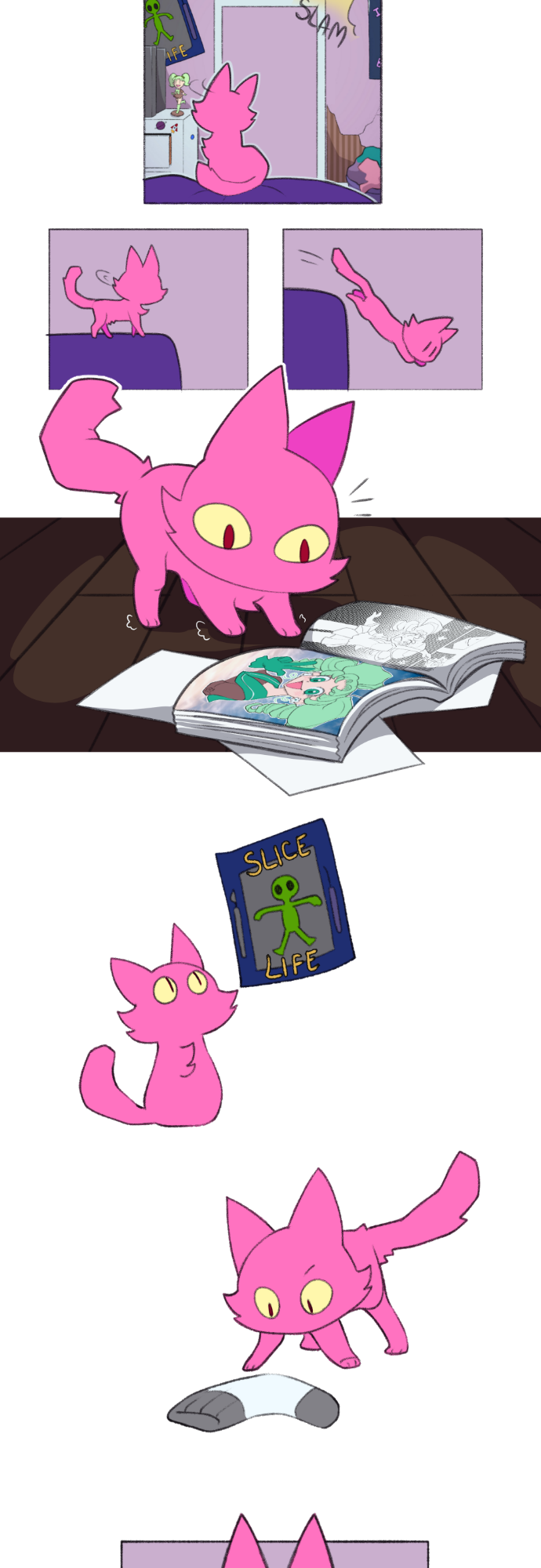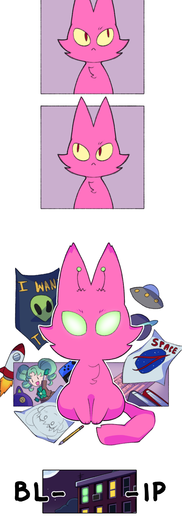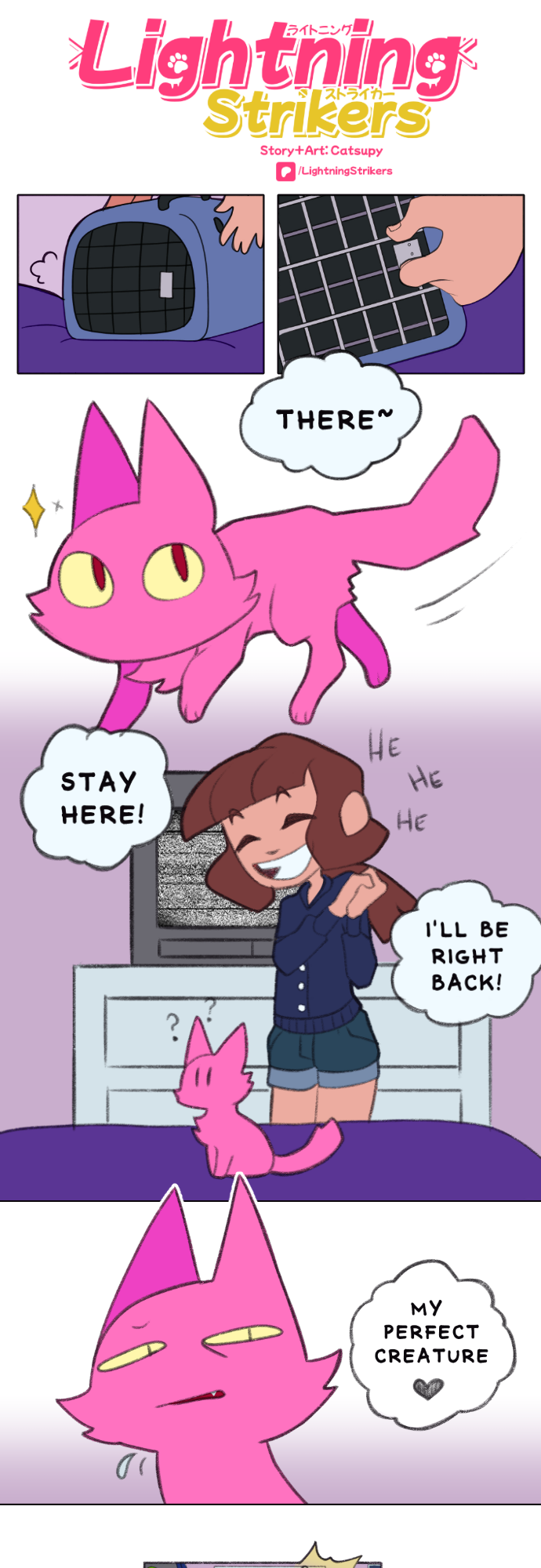 After the destruction of her home planet, Strike and others of her catty-kind are sent to Earth. But it's sort of hard to fit in when you're a weird alien cat, and you need to defend Earth from the same fame-obsessed assailant that turned your previous home planet into space trash. (Currently Updates every Wednesday at 9AM EST) (Please note some updates might look rough until I get the time to polish them)