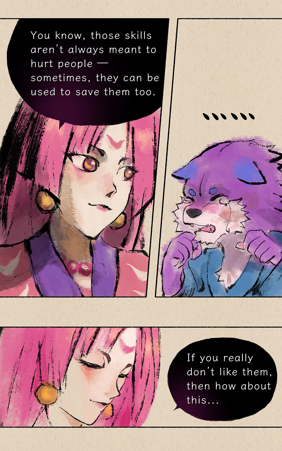 Regarding the presentation of flashback scenes, I originally planned to change the background color of blank spaces from white to black like many comics do, but black backgrounds don't actually suit the ink wash painting style well.