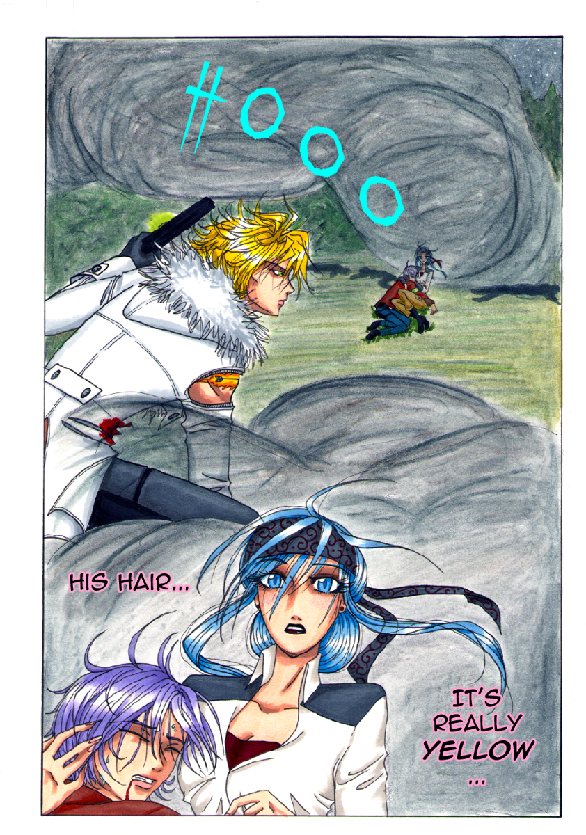 Mirrasae: Yes, Chya, his hair IS yellow. Ain't it purdy? Another fun fact (though it will come up later in the comic, I wanna tell you now anyway): His hair has the feel and somewhat-the-texture of down feathers. Yes, like a baby chick. That, and sharply-pointed ear-lobes are some of the defining traits of the Anonian race. (You can see what I mean in some of the past pages, if you glance back through them.)
