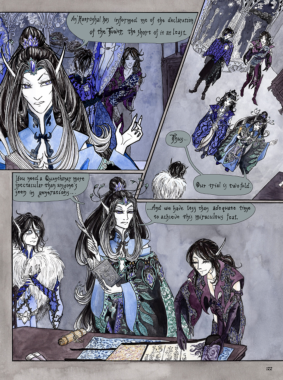 It's nice to be on time promptly for once UwU And I'll start the next page promptly too! trying my best to keep the last few months of 2025 in good order! Finally getting to draw Sadh Waentia in all their nuiva glory (there's no word for nuiva in English, sorry. Aloof comes slightly close but it is still way too far off the mark. Just gotta learn Finnish y'all who don't already :<) really helps to motivate me though. And now their nice assistant makes an appearance too, so many elves :3c