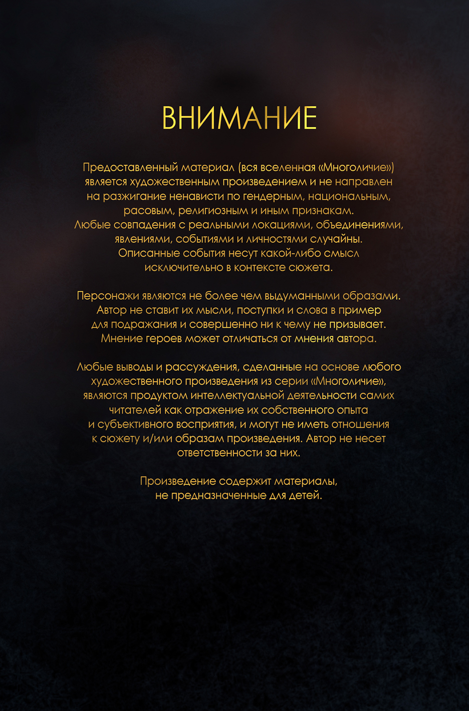 ДИСКЛЕЙМЕР: В комиксе встречаются сцены курения, употребления алкоголя, частичная нагота, кровь, смерть персонажей. Предоставленный материал (вся вселенная «Многоличие») является художественным произведением и не направлен на разжигание ненависти по гендерным, национальным, расовым, религиозным и иным признакам.