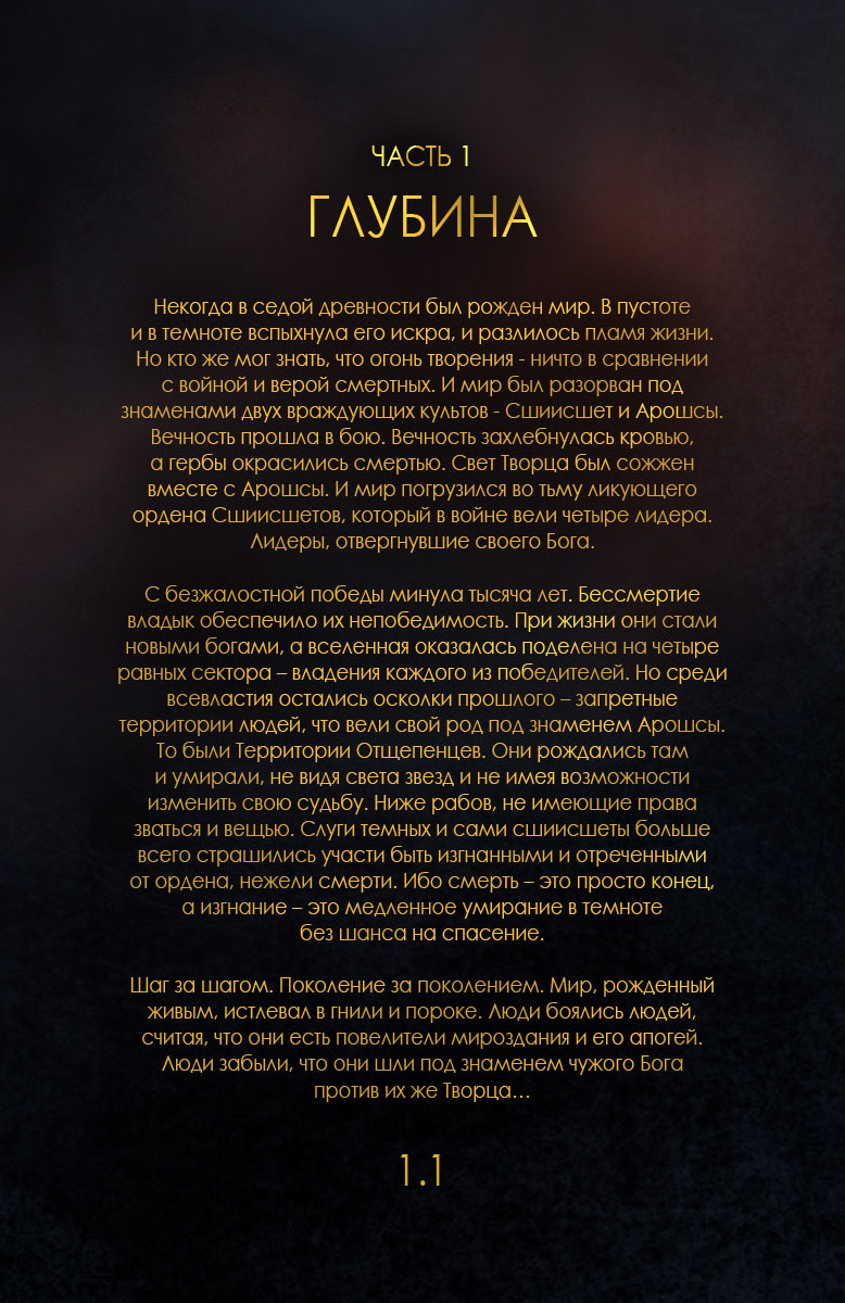 С безжалостной победы минула тысяча лет. Бессмертие владык обеспечило их непобедимость, а вселенная оказалась поделена на четыре равных сектора. Но среди всевластия тьмы остались запретные территории людей, что длили свой род от Арошсы. Люди рождались там и умирали, не видя света звезд и не имея возможности изменить свою судьбу. Слуги темных и сами сшиисшеты больше всего страшились участи быть изгнанными и отреченными от ордена, нежели смерти. Так мир, рожденный живым, истлевал в гнили. Люди боялись людей, отчаянно считая себя апогеем мироздания. Все шло своим чередом к бездне мрака и боли. И мог ли кто-нибудь представить, что гибнущий под ядовитым слоем цивилизации мир изменится от появления нового игрока?